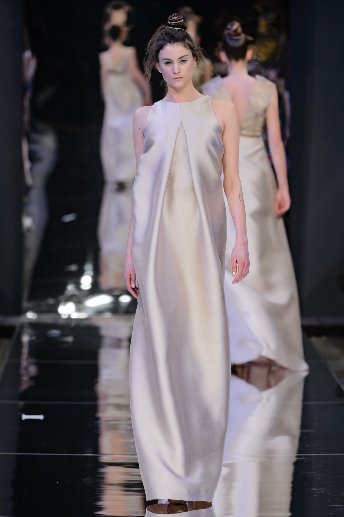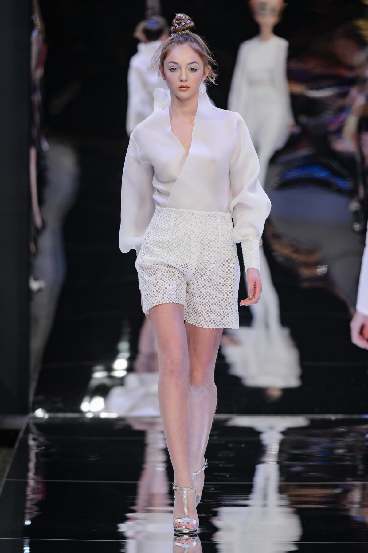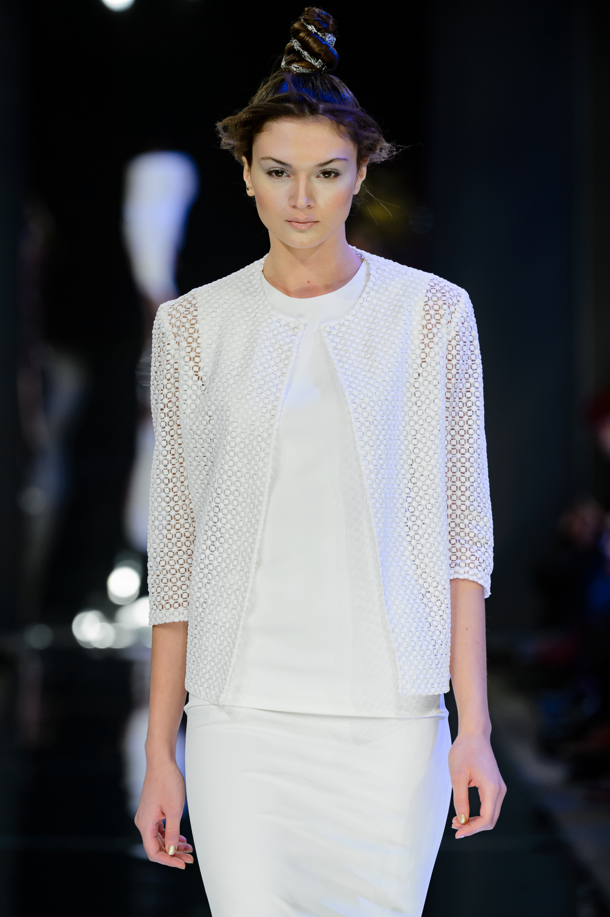 L’intaglio della pietra per creare lo Jaali viene interpretato da Sabrina Persechino nella creazione del macramè geometrico che diventa elemento di forza e trasparenza negli abiti bianchi dalle forme lineari e pulite. Una trama nodosa a base quadrata a disegnare una griglia ornamentale che lascia spiare la siluette esaltandone la femminilità.