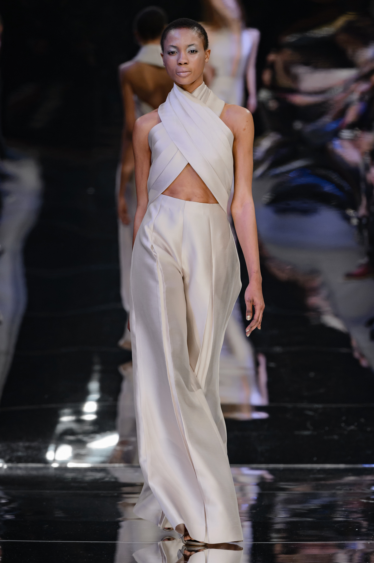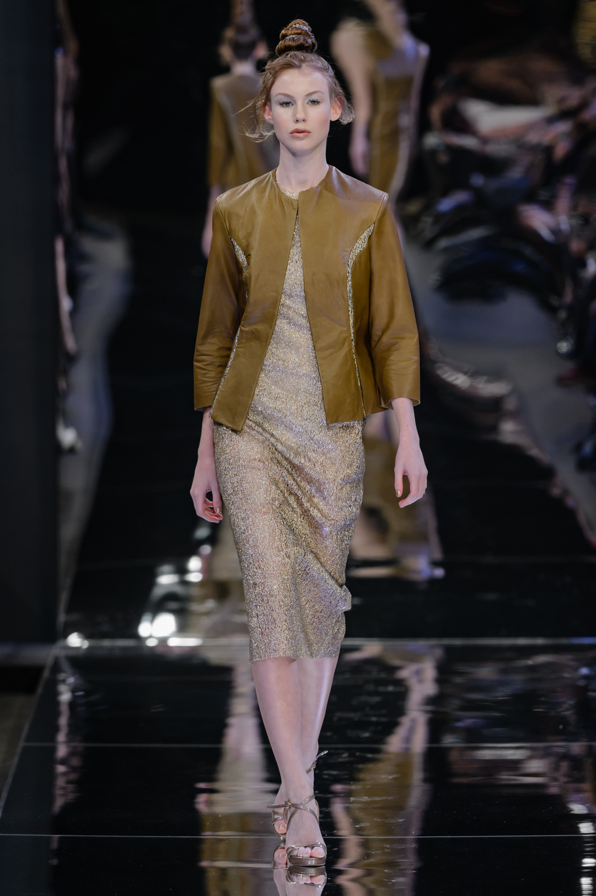 Dal gioco della rifrazione e dalla deviazione subita dall’onda luminosa attraverso il passaggio nella Jaali scaturisce il tessuto in filigrana oro. Un intreccio di sottili fili in resina ritorti a creare un elegante effetto di struttura traforata. Il taglio netto sulle pelli dal colore olio, crea intarsi e fessure, feritoie di luce e geometrie perfette su prospetti razionalisti di estrema indossabilità. All’oro è affidato il compito di fil rouge della collezione: elemento di legame e connessione tra tutte le altre trame in piqué di seta nero e sabbia le cui ampiezze emulano le suriyah libiche.