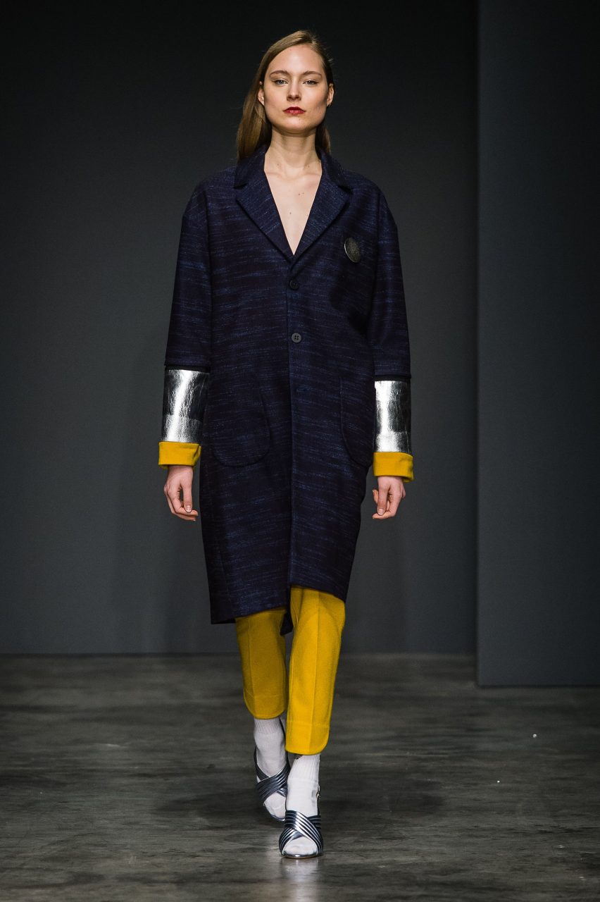 Seguendo quella che ormai diventata una della signature del brand, la collezione mischia materiali di natura e carattere diverso, spesso opposto. Panni morbidi nelle tonalità piene del nero, verde bottiglia e zucca si combinano con tessuti più movimentati, glitterati, gessati e a pois. In contrasto con l’essenzialità della superficie liscia del panno sono i tessuti a pelo, corto nei toni del castoro e del blu e più lungo e soffice in panna. Sono presenti anche il jeans, ormai entrato a far parte del vocabolario del brand, il gabardine di cotone e organza leggera. Le discrepanze dei tessuti sono appiattite dalle costruzioni essenziali dei capi, che mantengono la nettezza delle linee, pur esagerando nella loro elaborazione in volumi e lunghezze. Le linee sono rilassate e accarezzano il corpo senza definirlo. L’equilibrio di ogni outfit fuoriesce dai diversi livelli visivi che ogni singolo capo costruisce insieme con gli altri: ampi pantaloni, giacche e felpe corte in vita e camicie con polsi oversize; lunghi soprabiti e pantaloni cropped; completi ora morbidi, ora quasi striminziti, che designano una diversa idea di compostezza, e di rigore.