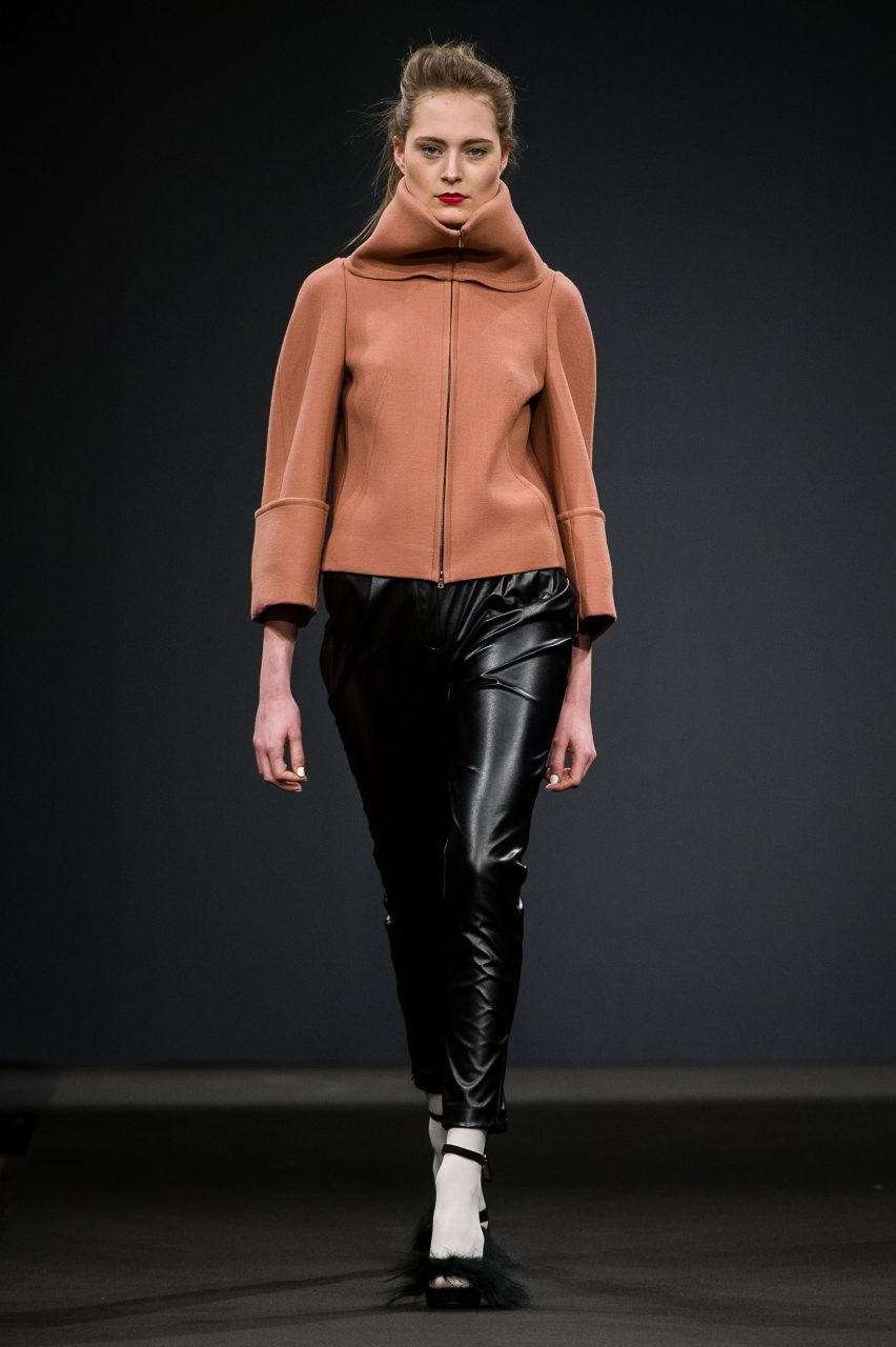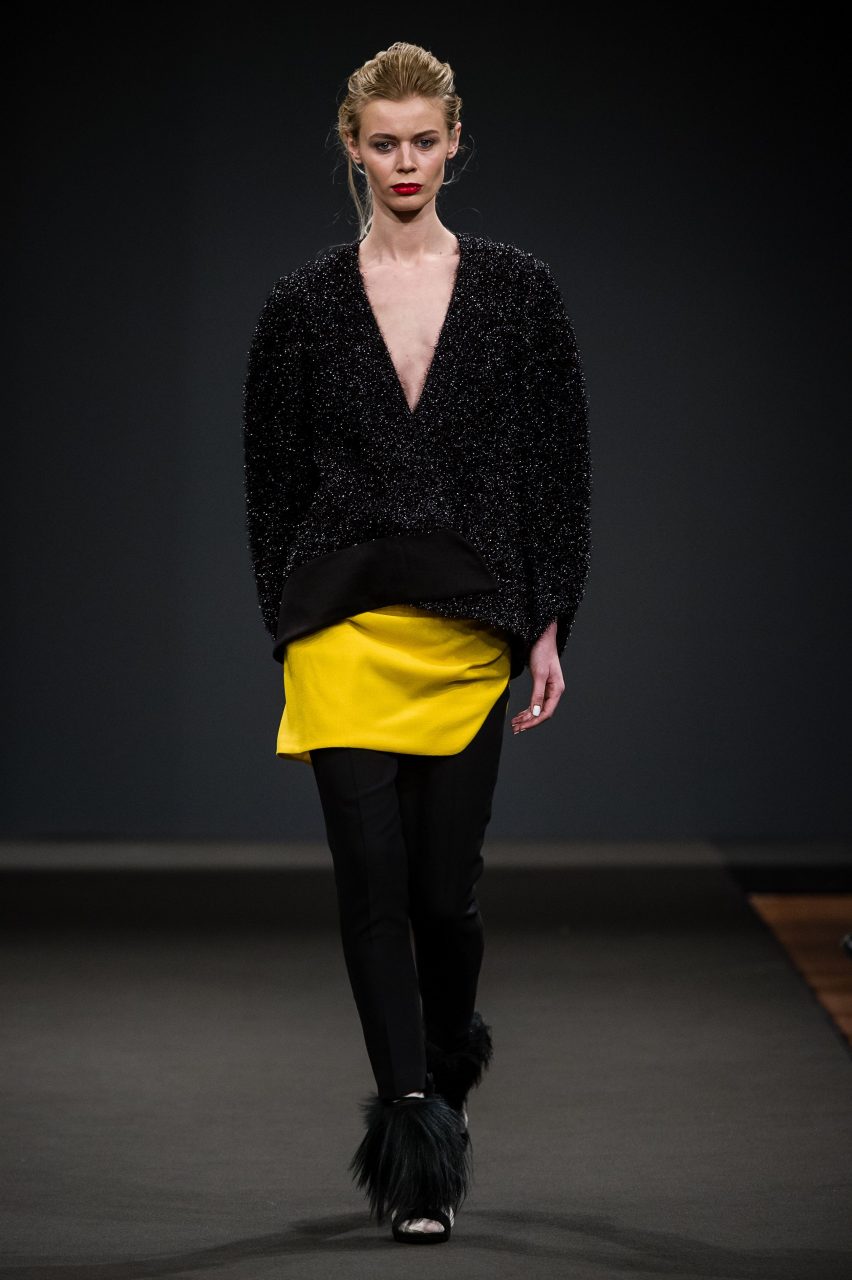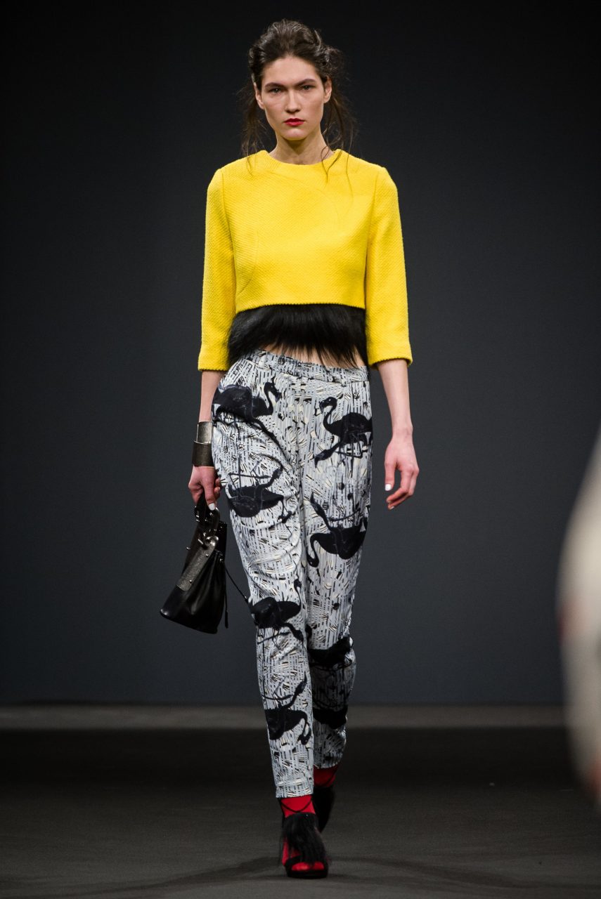 La ricerca di Arnoldo][Battois ha prodotto una collezione che mescola sapientemente suggestioni glamour dal sapore vintage e atmosfere decisamente contemporanee. Le silhouette allungate, che si restringono attorno alle gambe avvolgendo il corpo, sono esasperate sulla schiena, definita da volumi iper-costruiti, sui quali si innestano maniche ampie che partono da spalle piccole e arrotondate. La couture diventa Pop: il glamour della linea sessanta che sembra definire gli outfit è contraddetto e aggiornato da stampe acidissime, che muovono lane pesanti e sete morbide, disegnate da Arnoldo][Battois e prodotte in esclusiva per il brand dal Lanificio Paoletti. Scimmie, flamingo, dettagli architettonici di scorci veneziani, peonie, diventano paesaggi grafici che attraversano la collezione e la ritmano cromaticamente. Sovrastampe e retini rendono caleidoscopiche le visioni disegnate dalle stampe e le fanno entrare in relazione con le articolate sovrapposizioni strutturali dettate dalla modellistica. La complessità che fa interagire la visione acida della contemporaneità e le atmosfere che evocano un passato glamour, è sottolineata dalla scelta dei tessuti: lane double e panni ammorbiditi dai toni pastello si intrecciano a satin e cotoni neri, interrotti da inattese incursioni di pelliccia in lurex nero che attraversa i capispalla e anima alcuni dettagli dei capi.