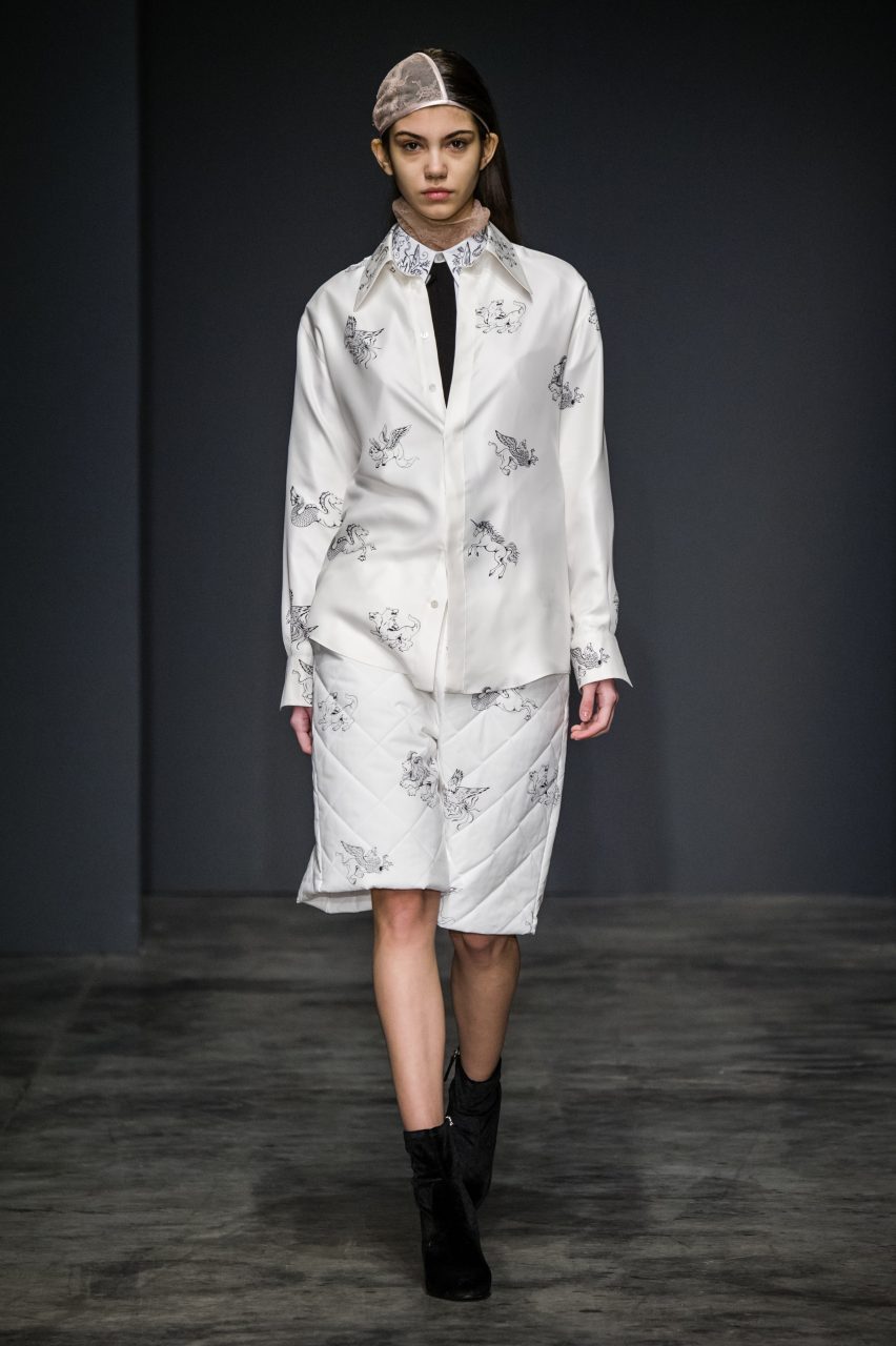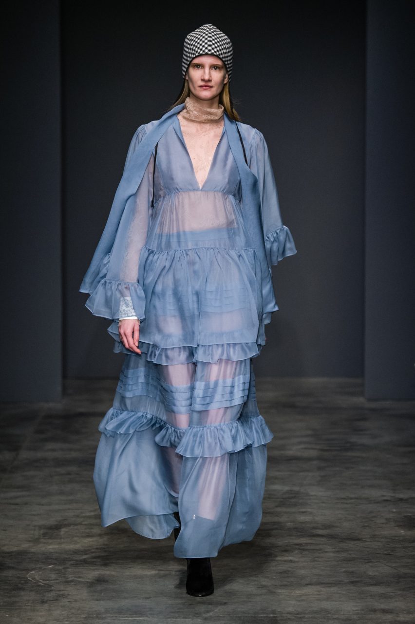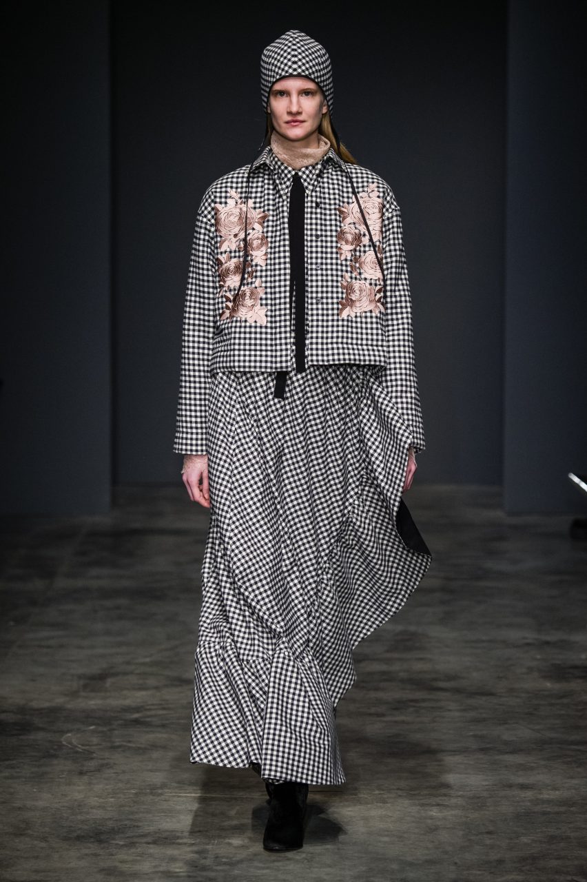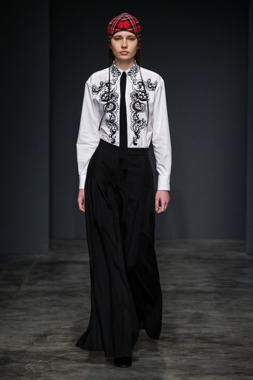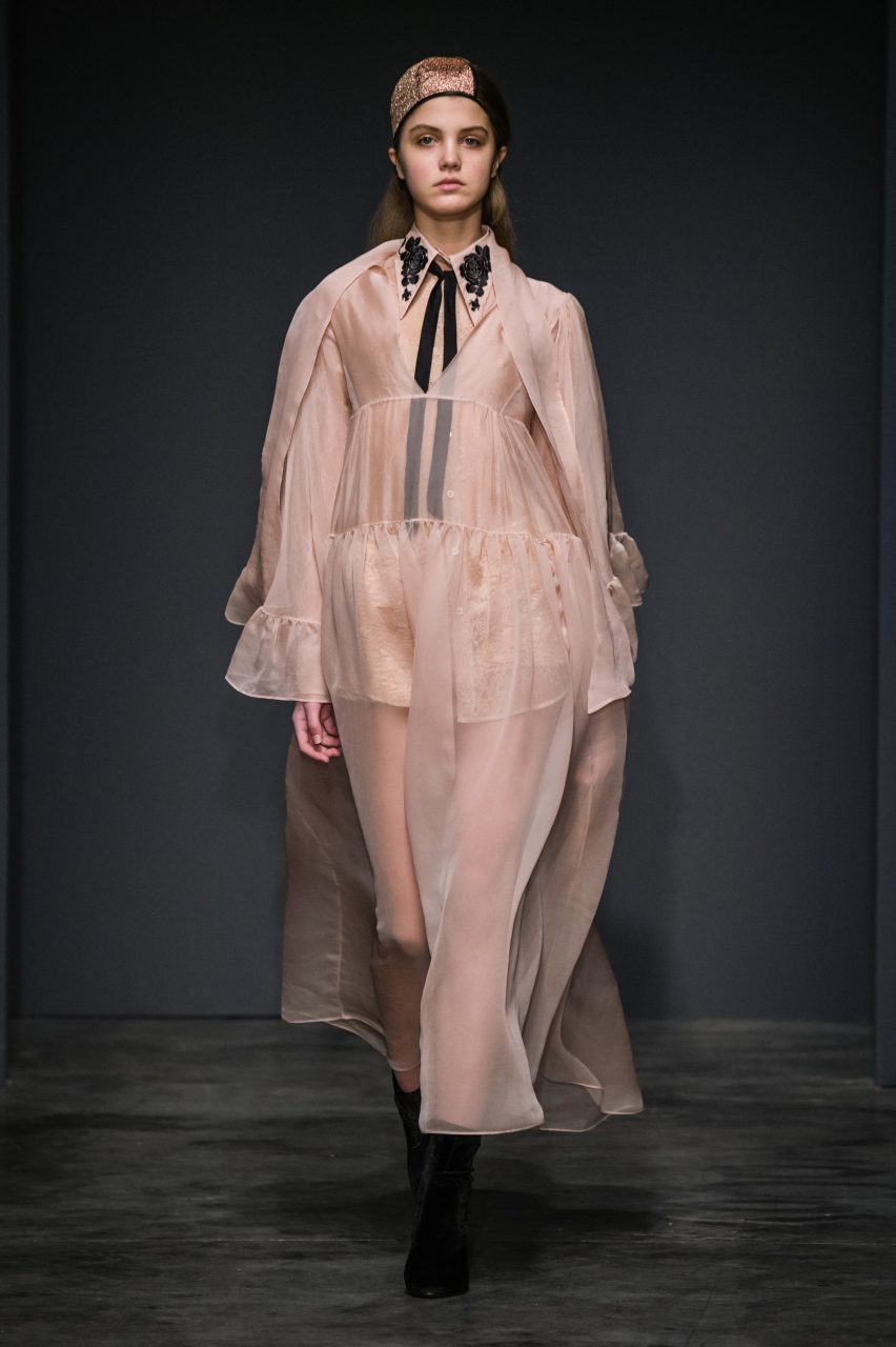 mescola luoghi e stili: il tartan scozzese, colli vittoriani e dettagli edoardiani con il barocco spagnolo e gli animali mitologici delle chiese gotiche francesi. Nascono così i ricami di fiori e un vestiario unico e astratto su materiali diversi. Il cotone maschile di tessiture da camiceria accostato alla mussola di seta, la lana tartan e il pizzo chantilly. Il velluto delavè e il tessuto tappezzeria. Candida broderie anglaise, dentro e fuori.