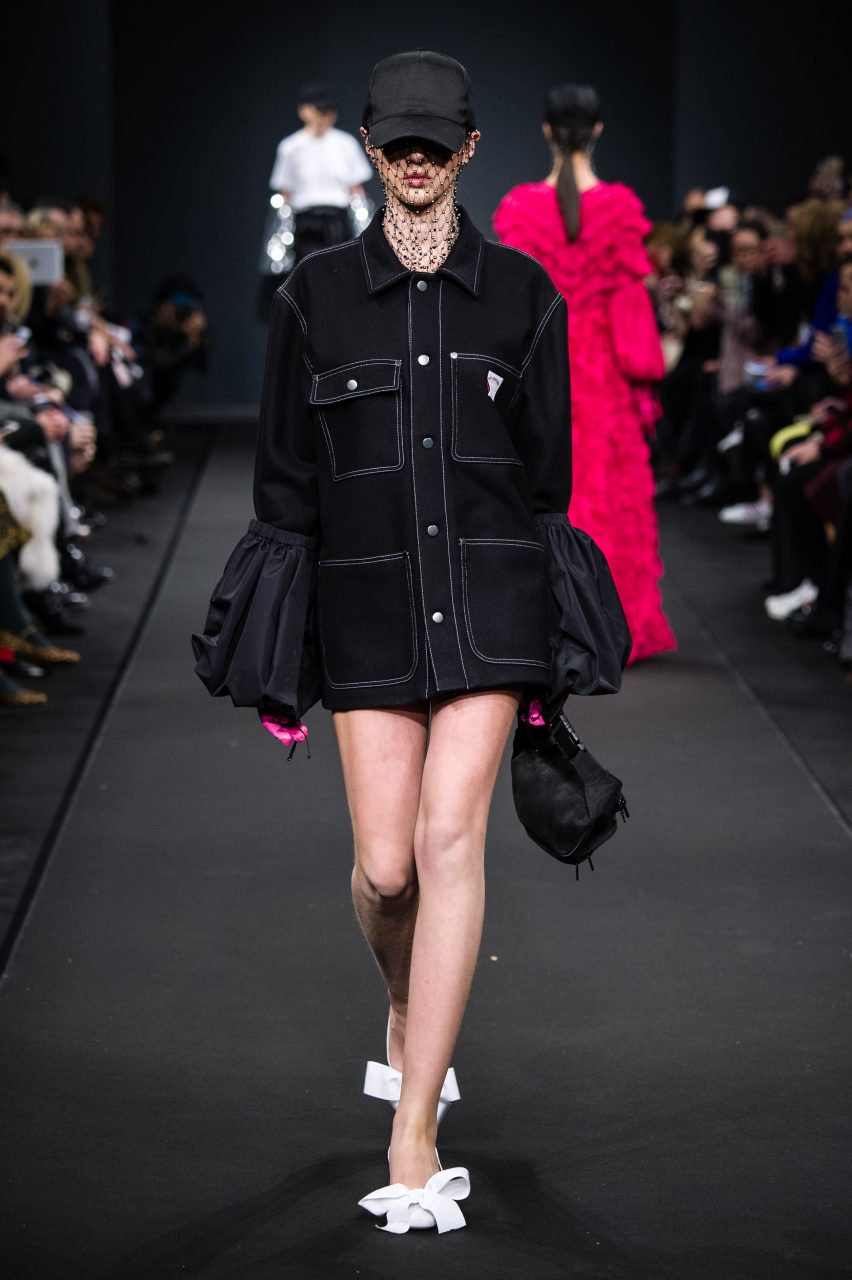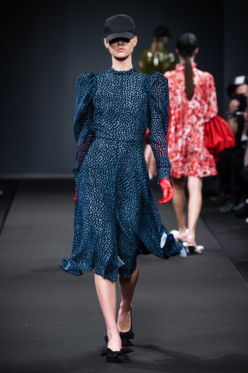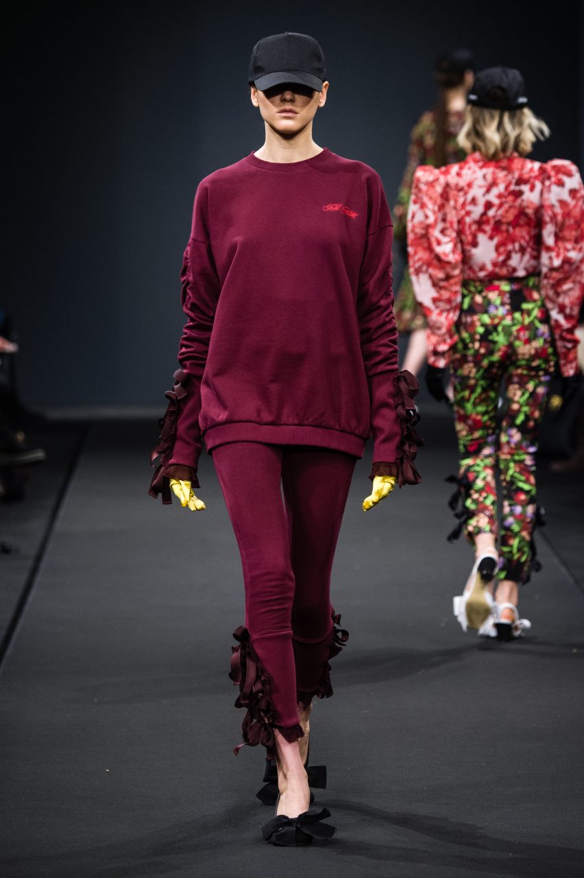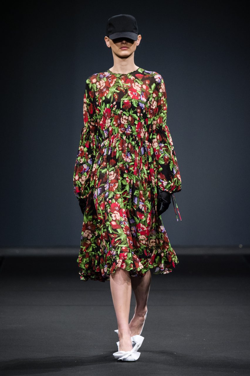 Le sue ragazze attingono con libertà al guardaroba maschile mixandone la pratica essenzialità all’ottimismo fluo degli anni ‘80. Gli abiti sognano in technicolor, in vivaci contrasti di rosso e viola, azzurro e bordeaux, fucsia e glicine. Su di essi, stampe geometriche si mixano a stampe floreali in eleganti composit digitali. L’attitude è sempre casual e naturale, schierando con disinvoltura abiti fluidi arricchiti da fiocchi, rouches e volant accanto a pezzi streetwear e pantaloni cargo con impunture a contrasto.