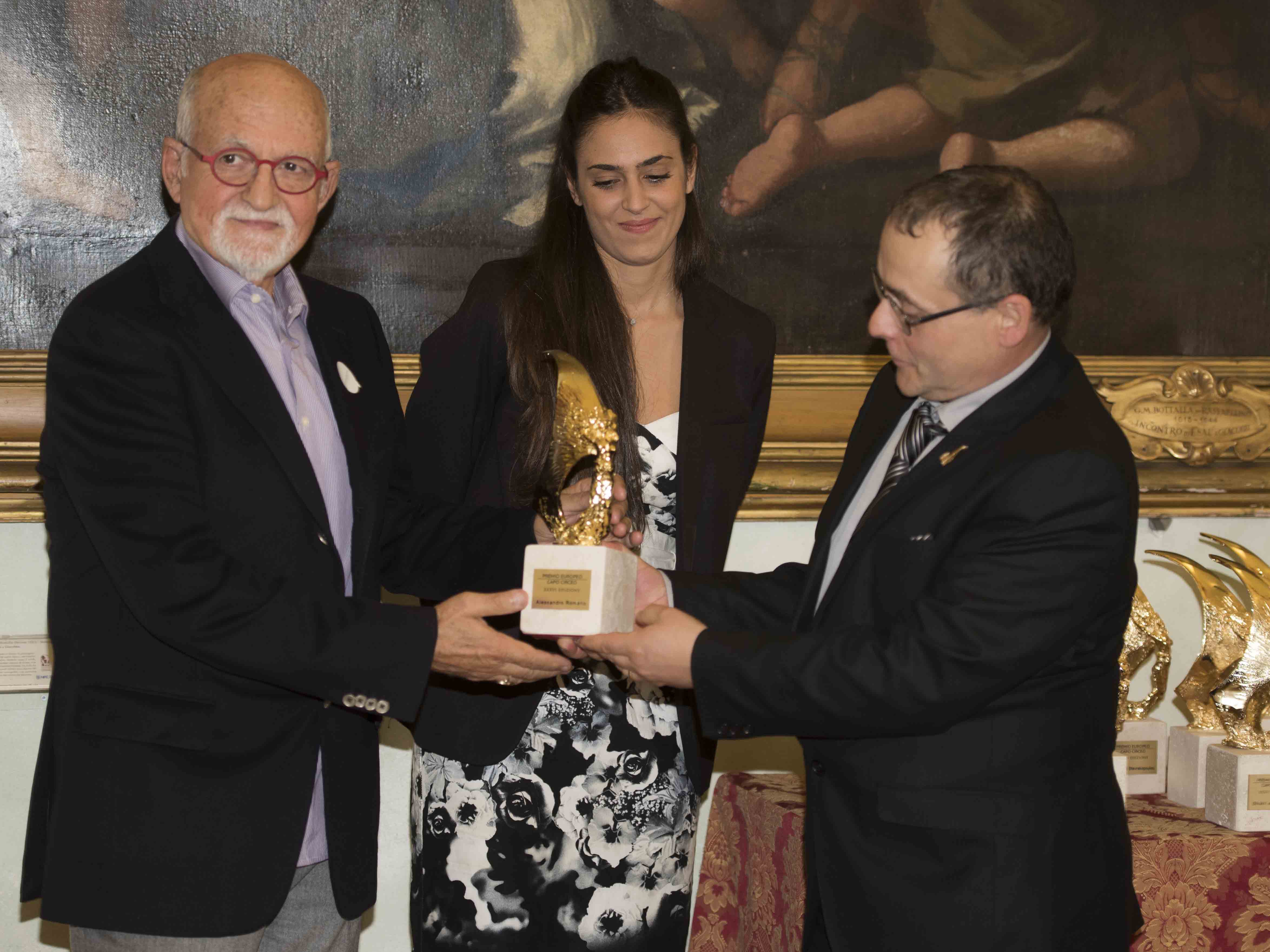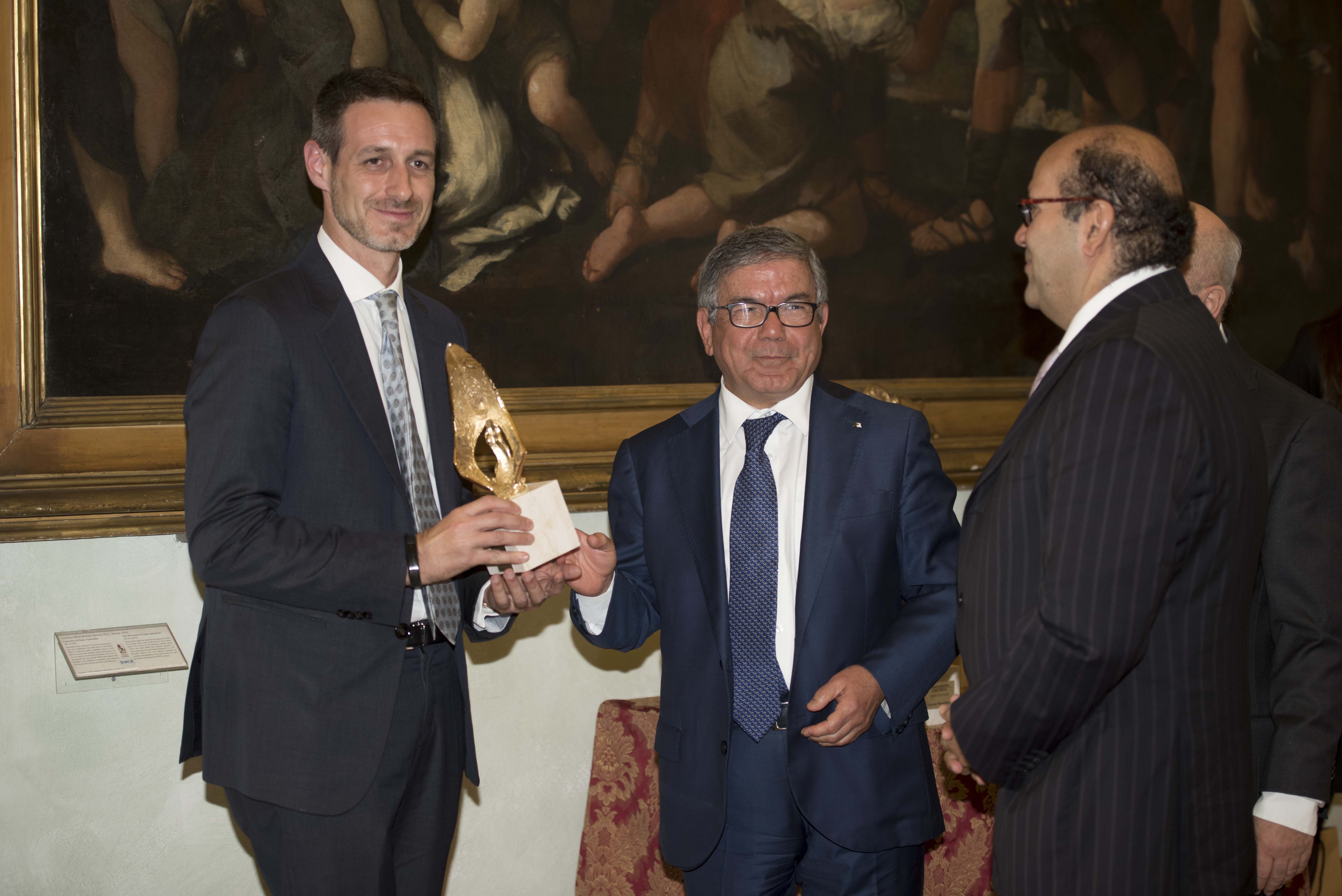 Premio al famoso progettista di ponti Ing. Enzio Siviero, propugnatore dei grandi ponti di connessione intecontinentale e del TUNeIT, consegna il premio lo scultore Alessandro Romano