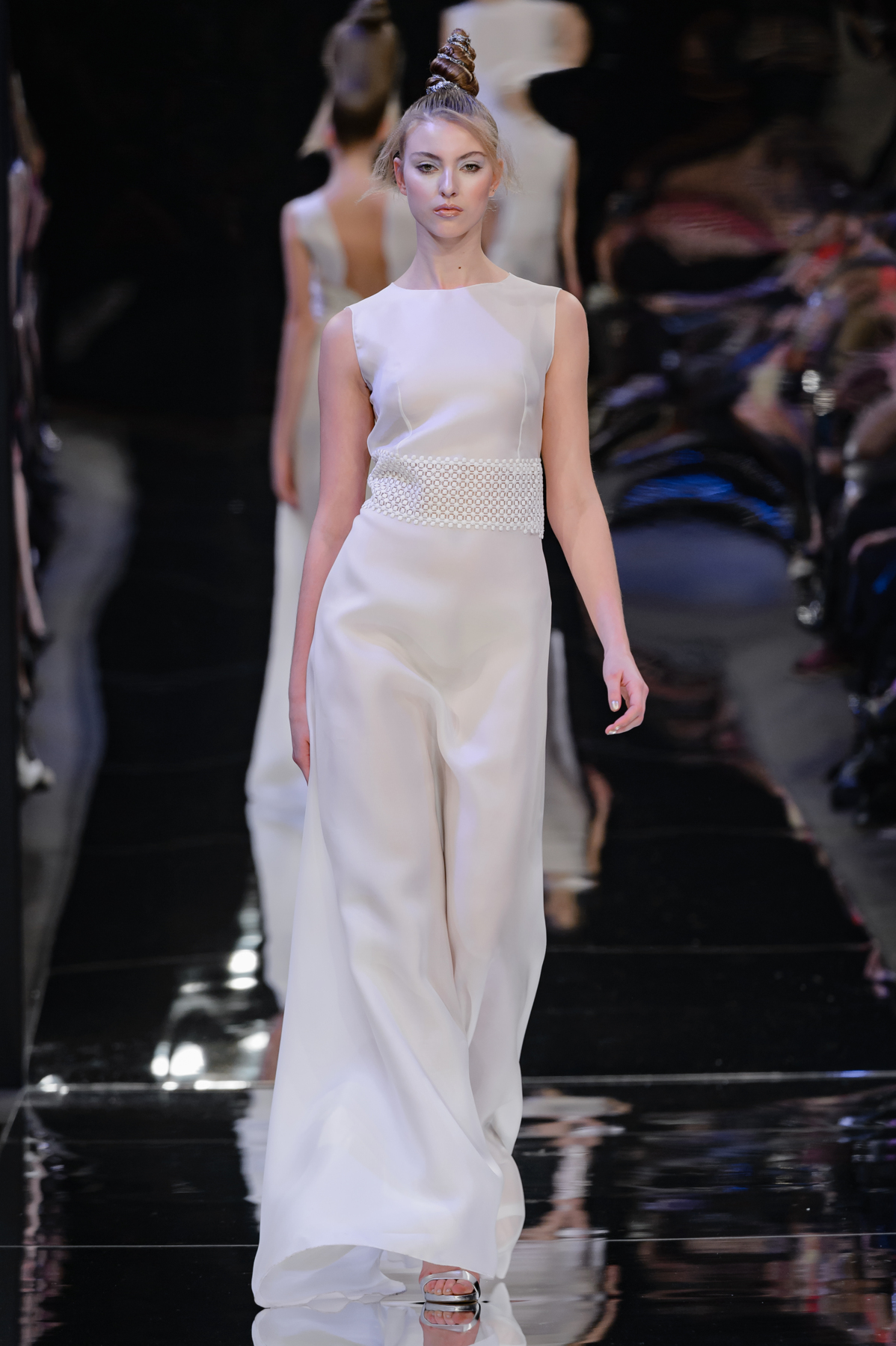 L’intaglio della pietra per creare lo Jaali viene interpretato da Sabrina Persechino nella creazione del macramè geometrico che diventa elemento di forza e trasparenza negli abiti bianchi dalle forme lineari e pulite. Una trama nodosa a base quadrata a disegnare una griglia ornamentale che lascia spiare la siluette esaltandone la femminilità.
