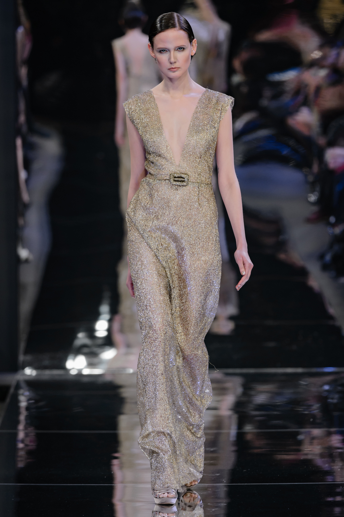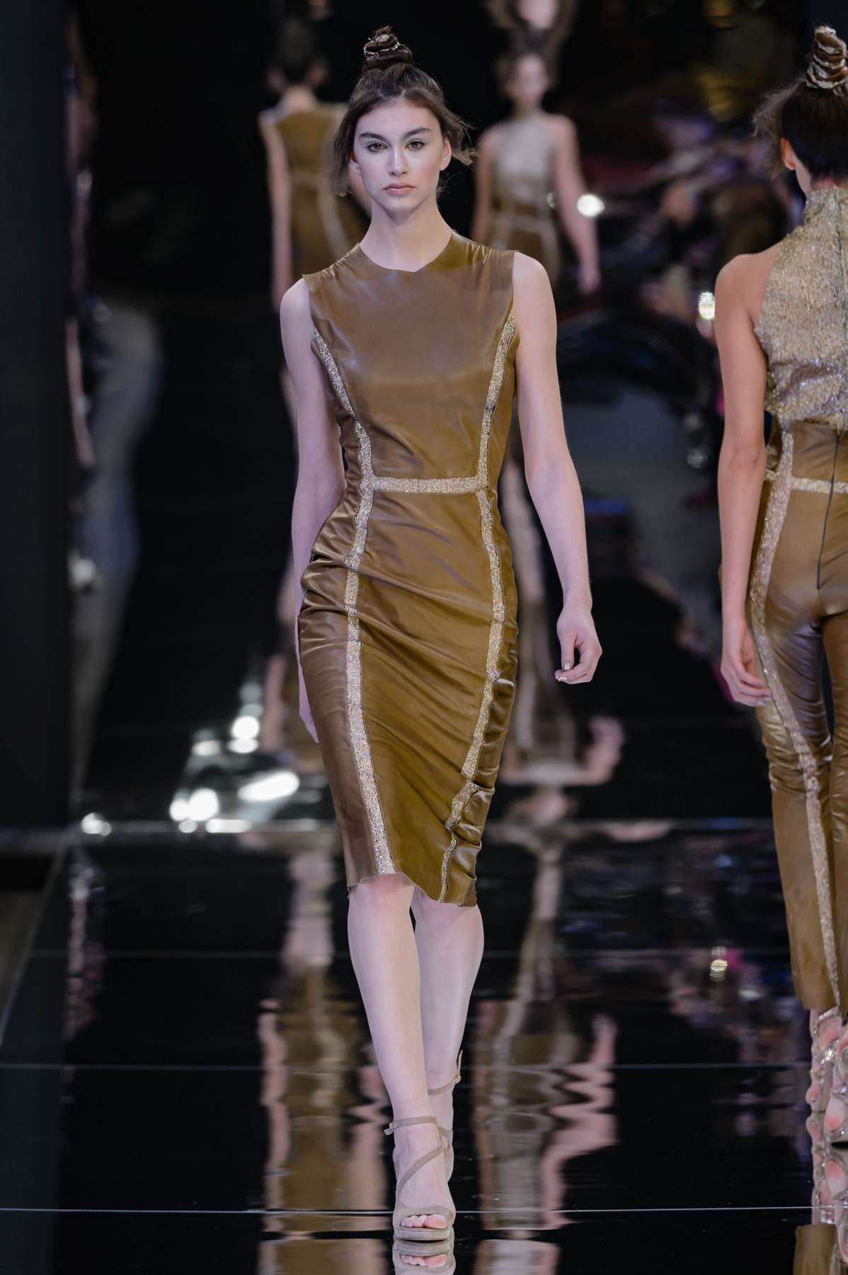 Dal gioco della rifrazione e dalla deviazione subita dall’onda luminosa attraverso il passaggio nella Jaali scaturisce il tessuto in filigrana oro. Un intreccio di sottili fili in resina ritorti a creare un elegante effetto di struttura traforata. Il taglio netto sulle pelli dal colore olio, crea intarsi e fessure, feritoie di luce e geometrie perfette su prospetti razionalisti di estrema indossabilità. All’oro è affidato il compito di fil rouge della collezione: elemento di legame e connessione tra tutte le altre trame in piqué di seta nero e sabbia le cui ampiezze emulano le suriyah libiche.