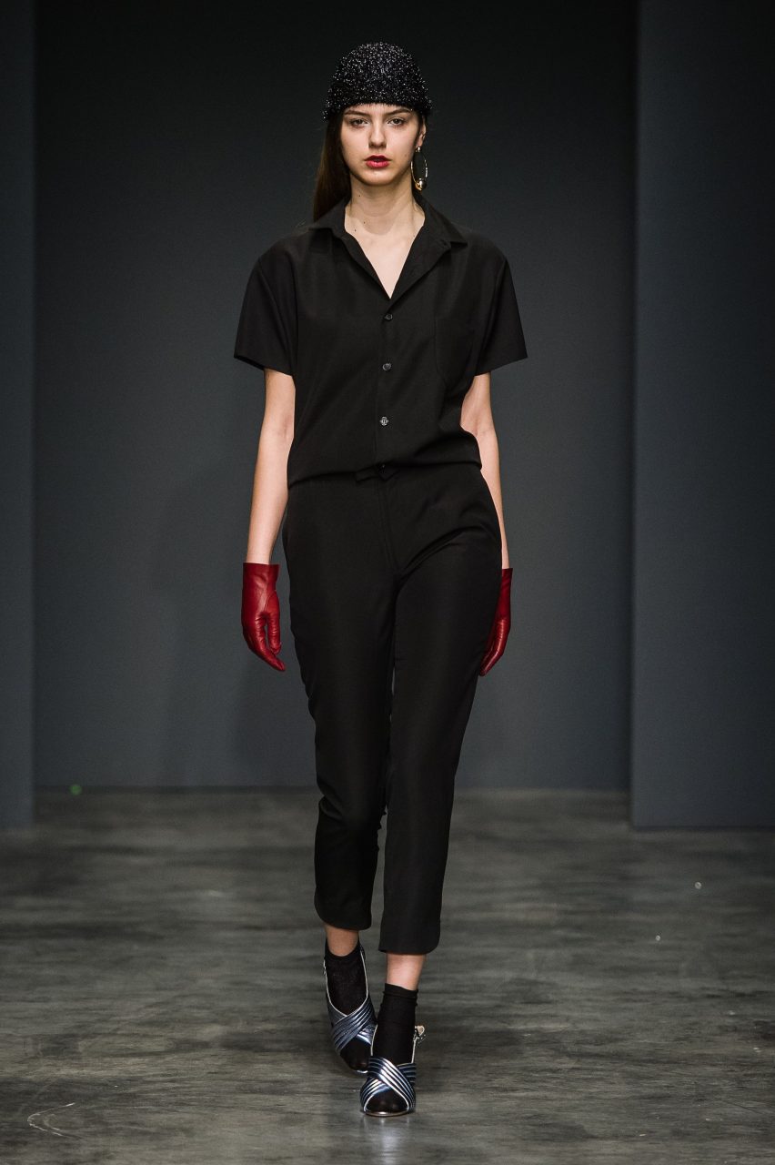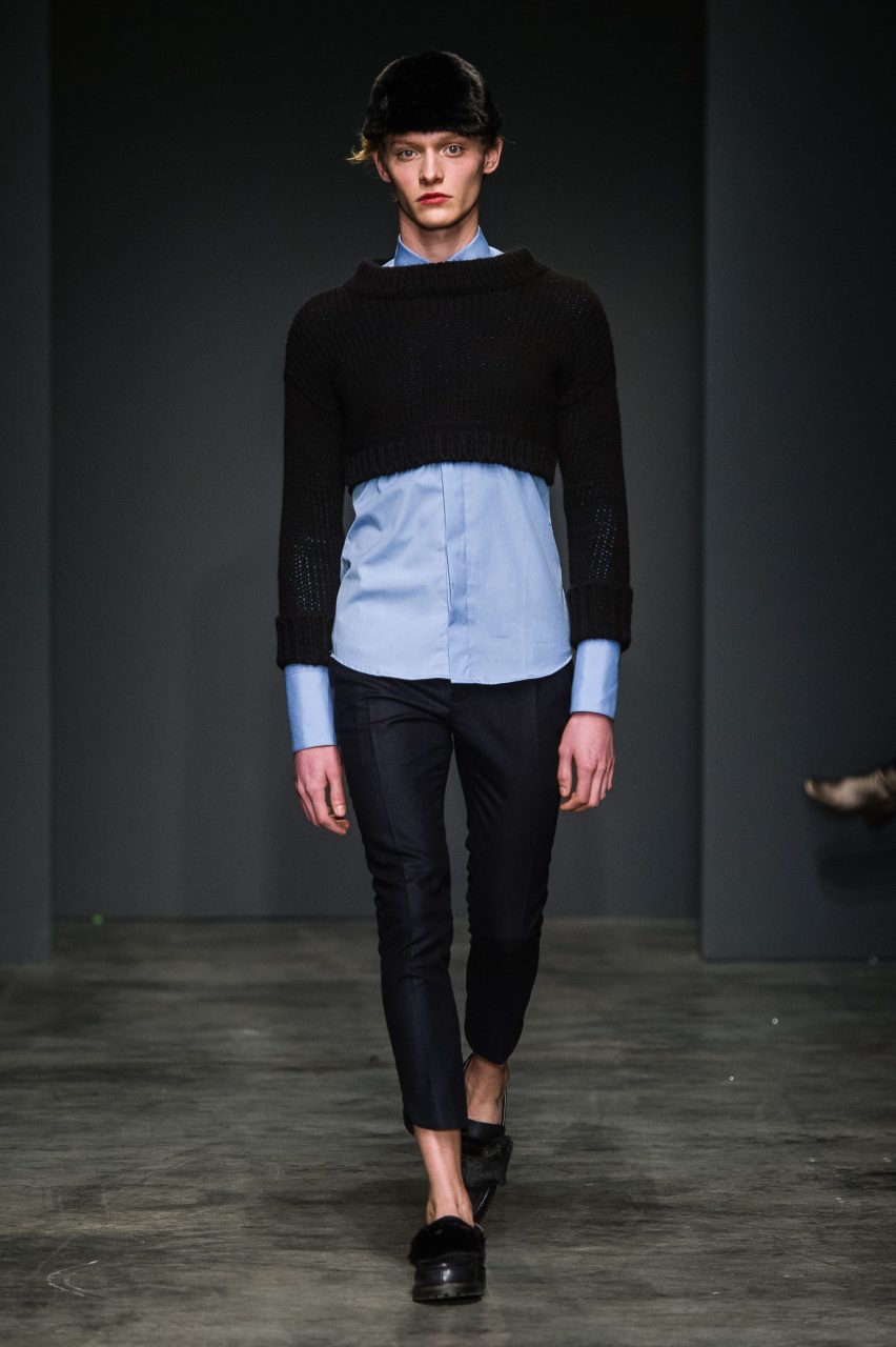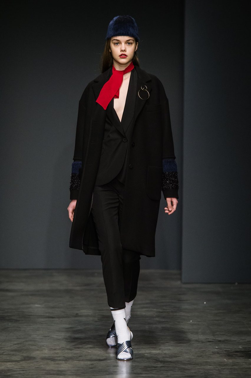 Seguendo quella che ormai diventata una della signature del brand, la collezione mischia materiali di natura e carattere diverso, spesso opposto. Panni morbidi nelle tonalità piene del nero, verde bottiglia e zucca si combinano con tessuti più movimentati, glitterati, gessati e a pois. In contrasto con l’essenzialità della superficie liscia del panno sono i tessuti a pelo, corto nei toni del castoro e del blu e più lungo e soffice in panna. Sono presenti anche il jeans, ormai entrato a far parte del vocabolario del brand, il gabardine di cotone e organza leggera. Le discrepanze dei tessuti sono appiattite dalle costruzioni essenziali dei capi, che mantengono la nettezza delle linee, pur esagerando nella loro elaborazione in volumi e lunghezze. Le linee sono rilassate e accarezzano il corpo senza definirlo. L’equilibrio di ogni outfit fuoriesce dai diversi livelli visivi che ogni singolo capo costruisce insieme con gli altri: ampi pantaloni, giacche e felpe corte in vita e camicie con polsi oversize; lunghi soprabiti e pantaloni cropped; completi ora morbidi, ora quasi striminziti, che designano una diversa idea di compostezza, e di rigore.