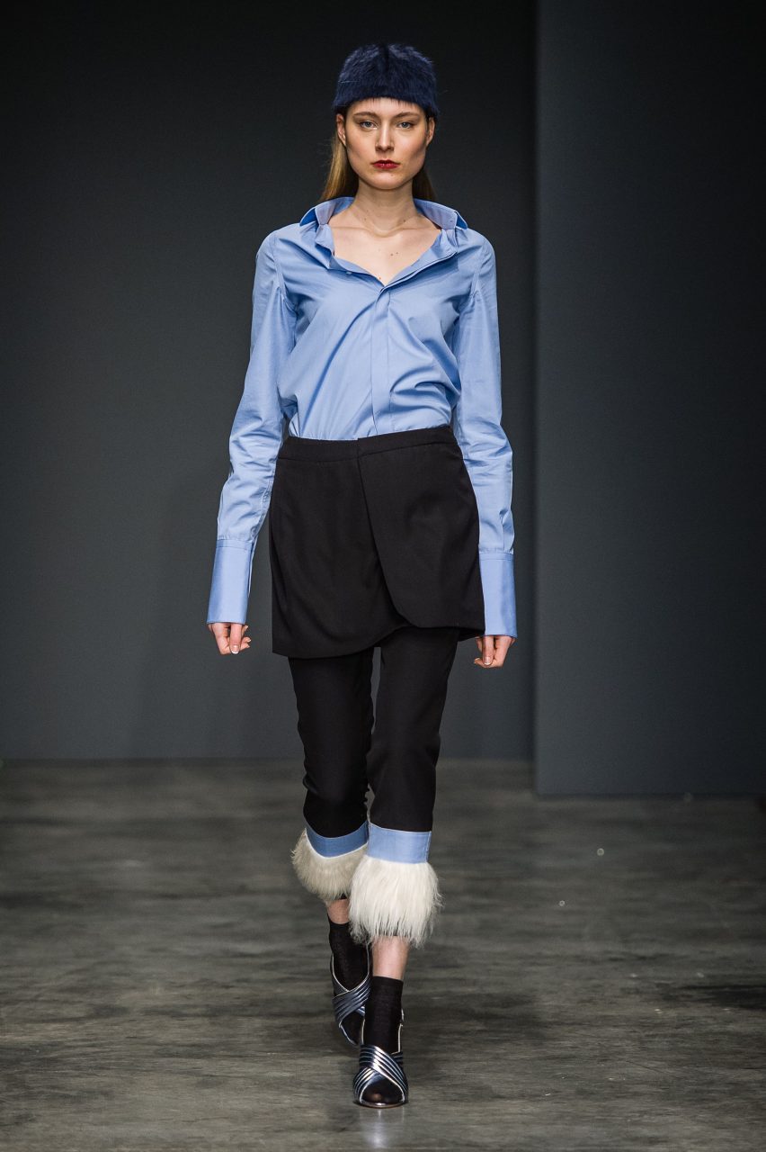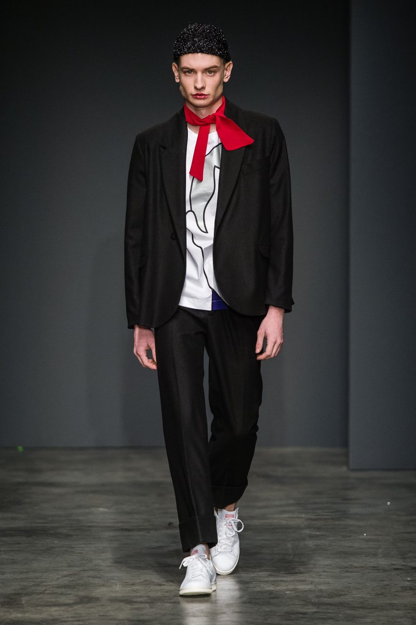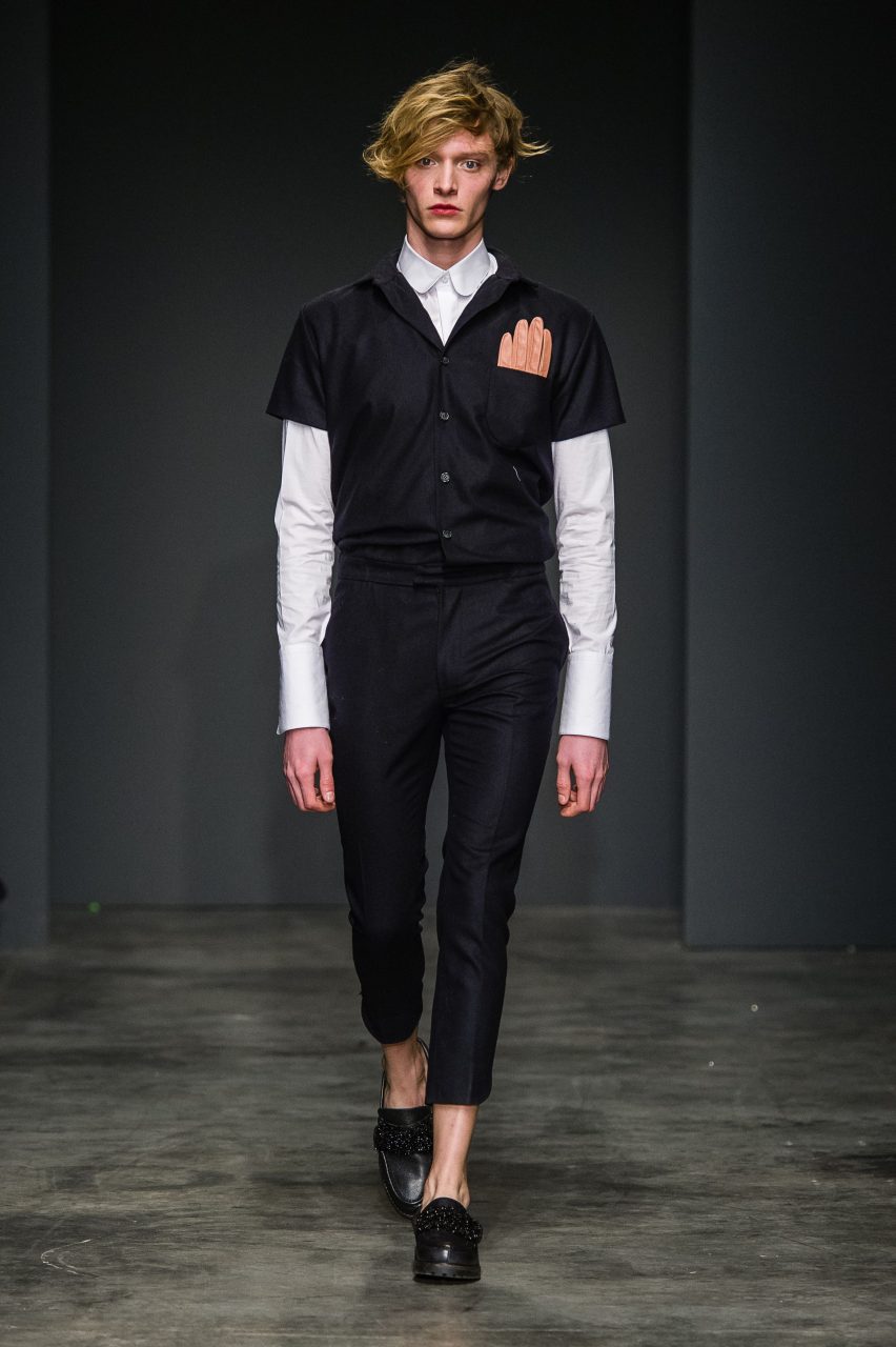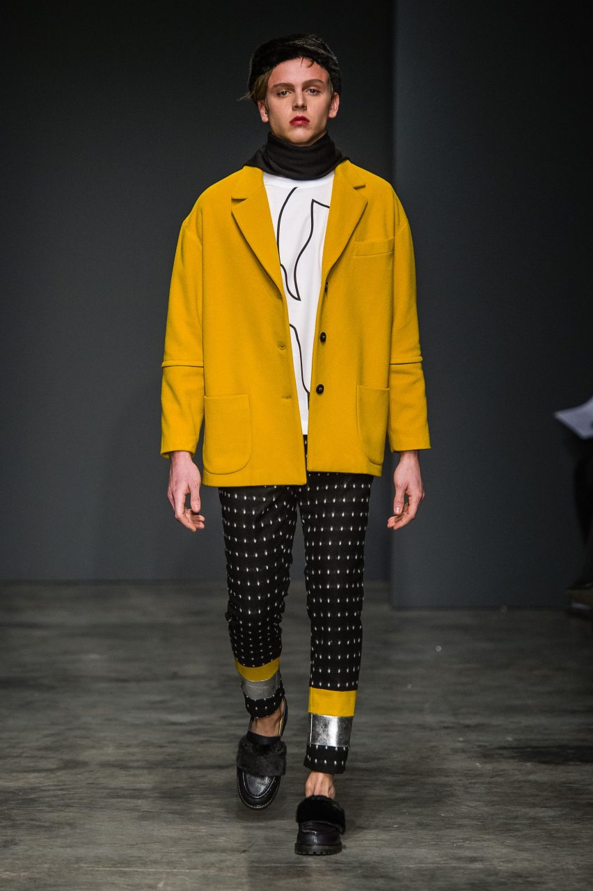 Seguendo quella che ormai diventata una della signature del brand, la collezione mischia materiali di natura e carattere diverso, spesso opposto. Panni morbidi nelle tonalità piene del nero, verde bottiglia e zucca si combinano con tessuti più movimentati, glitterati, gessati e a pois. In contrasto con l’essenzialità della superficie liscia del panno sono i tessuti a pelo, corto nei toni del castoro e del blu e più lungo e soffice in panna. Sono presenti anche il jeans, ormai entrato a far parte del vocabolario del brand, il gabardine di cotone e organza leggera. Le discrepanze dei tessuti sono appiattite dalle costruzioni essenziali dei capi, che mantengono la nettezza delle linee, pur esagerando nella loro elaborazione in volumi e lunghezze. Le linee sono rilassate e accarezzano il corpo senza definirlo. L’equilibrio di ogni outfit fuoriesce dai diversi livelli visivi che ogni singolo capo costruisce insieme con gli altri: ampi pantaloni, giacche e felpe corte in vita e camicie con polsi oversize; lunghi soprabiti e pantaloni cropped; completi ora morbidi, ora quasi striminziti, che designano una diversa idea di compostezza, e di rigore.