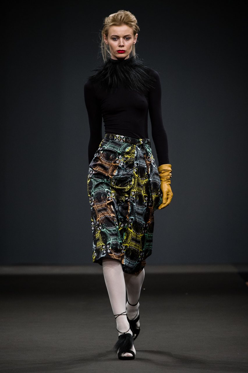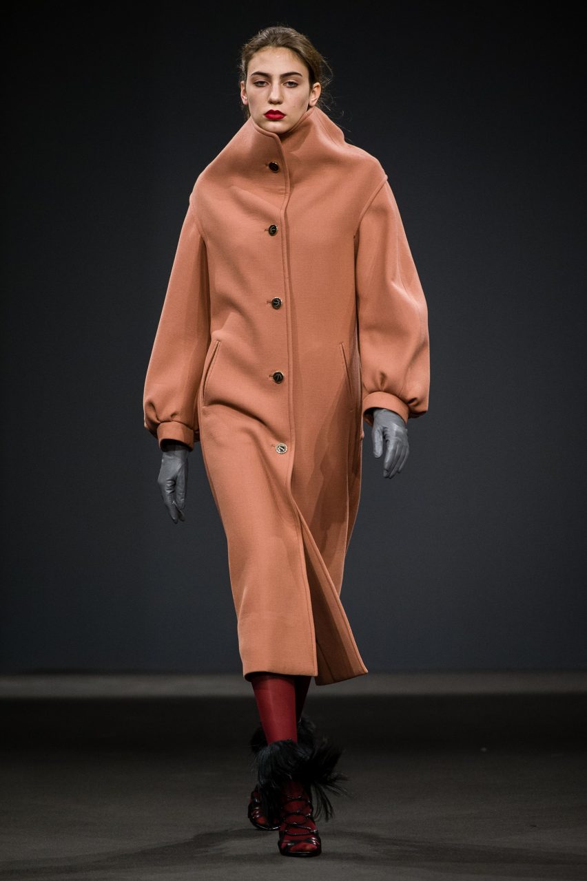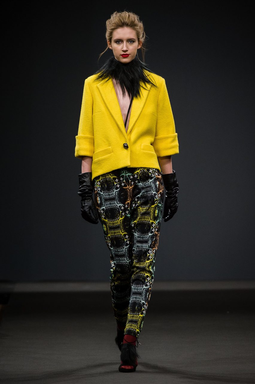 La ricerca di Arnoldo][Battois ha prodotto una collezione che mescola sapientemente suggestioni glamour dal sapore vintage e atmosfere decisamente contemporanee. Le silhouette allungate, che si restringono attorno alle gambe avvolgendo il corpo, sono esasperate sulla schiena, definita da volumi iper-costruiti, sui quali si innestano maniche ampie che partono da spalle piccole e arrotondate. La couture diventa Pop: il glamour della linea sessanta che sembra definire gli outfit è contraddetto e aggiornato da stampe acidissime, che muovono lane pesanti e sete morbide, disegnate da Arnoldo][Battois e prodotte in esclusiva per il brand dal Lanificio Paoletti. Scimmie, flamingo, dettagli architettonici di scorci veneziani, peonie, diventano paesaggi grafici che attraversano la collezione e la ritmano cromaticamente. Sovrastampe e retini rendono caleidoscopiche le visioni disegnate dalle stampe e le fanno entrare in relazione con le articolate sovrapposizioni strutturali dettate dalla modellistica. La complessità che fa interagire la visione acida della contemporaneità e le atmosfere che evocano un passato glamour, è sottolineata dalla scelta dei tessuti: lane double e panni ammorbiditi dai toni pastello si intrecciano a satin e cotoni neri, interrotti da inattese incursioni di pelliccia in lurex nero che attraversa i capispalla e anima alcuni dettagli dei capi.