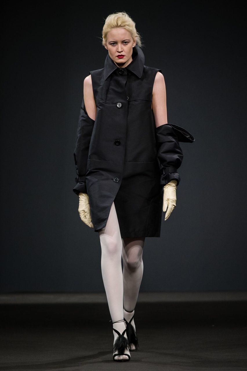 La consolidata attenzione per i dettagli che ha reso iconiche le borse di Arnoldo][Battois si trasferisce sui capi della collezione: sulle spalle a scatola dei capispalla si innestano borse piccole come mostrine militari, che improvvisamente diventano gioielli e si intrecciano ai bottoni vintage, animati dai riflessi del peltro e dell’oro.