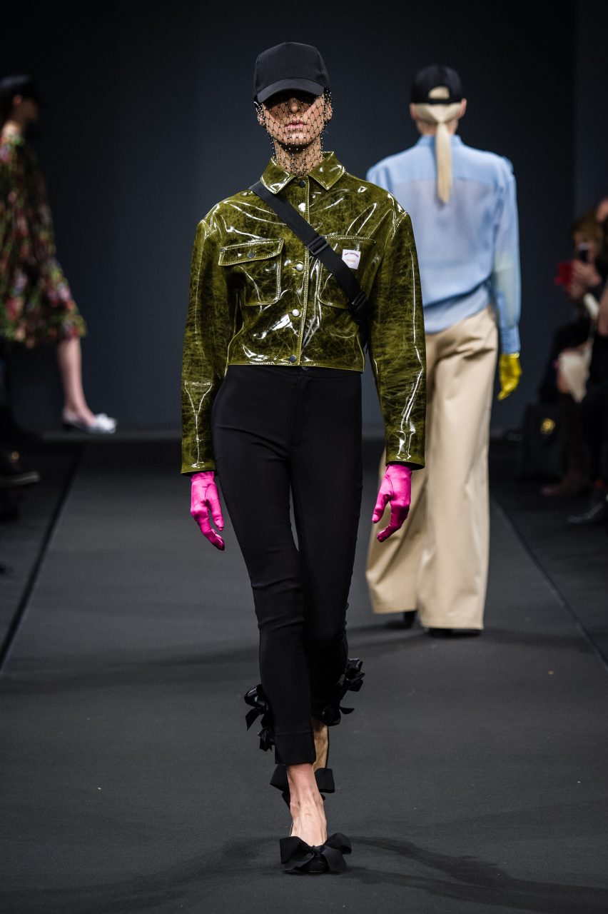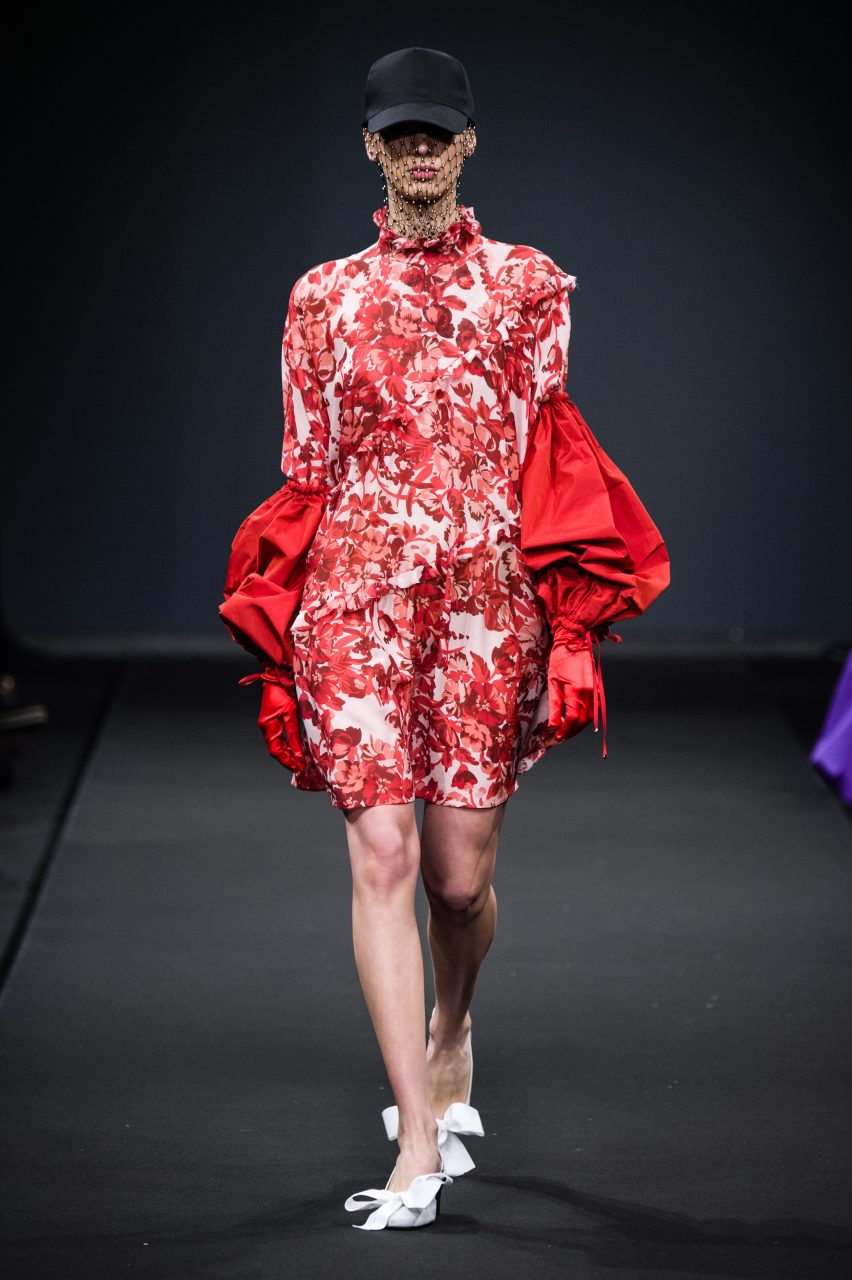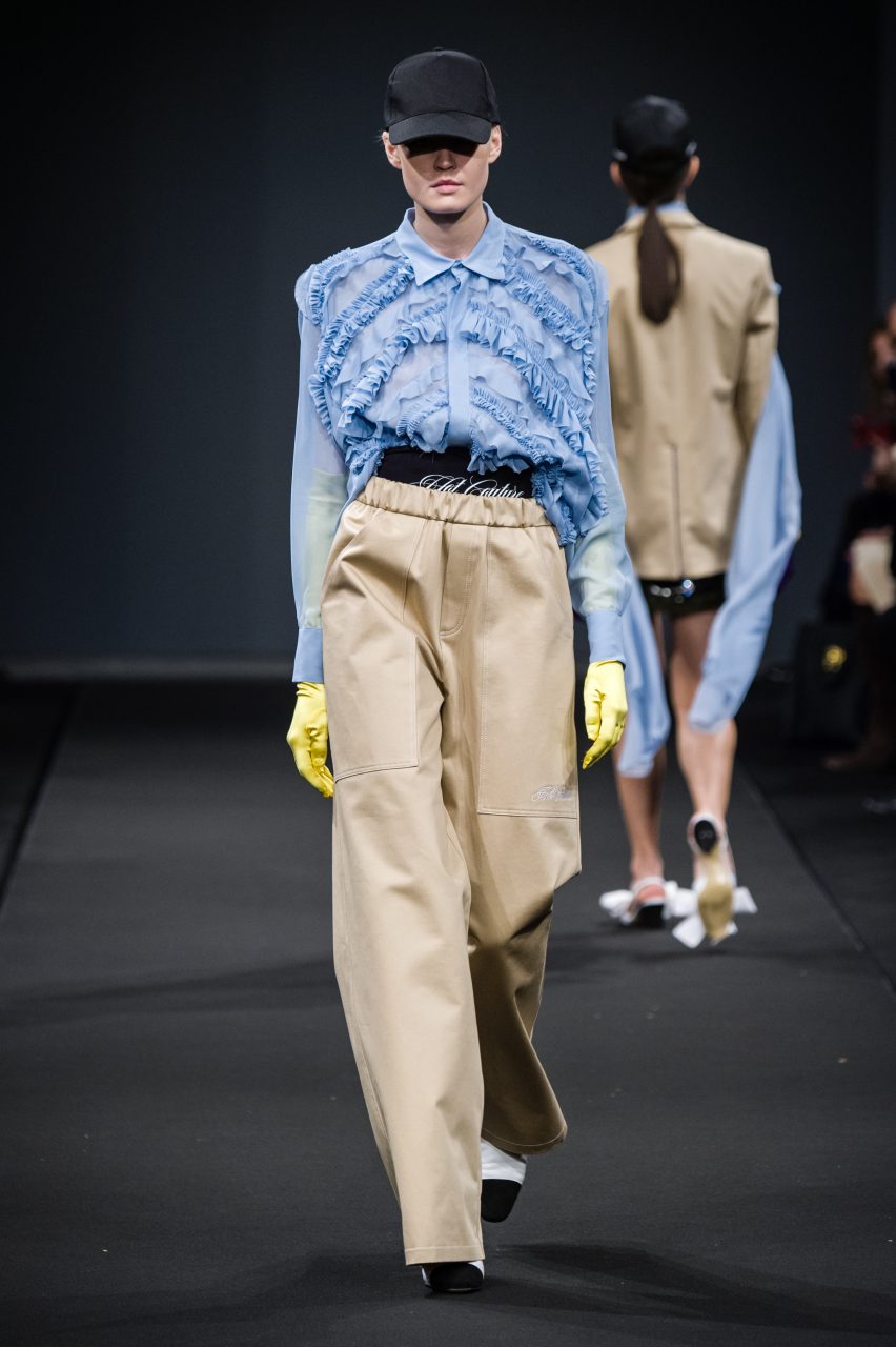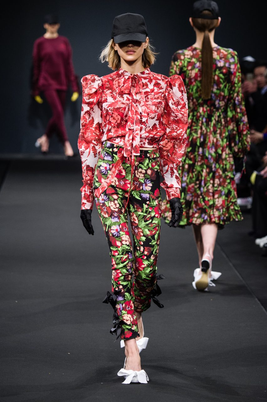 Le sue ragazze attingono con libertà al guardaroba maschile mixandone la pratica essenzialità all’ottimismo fluo degli anni ‘80. Gli abiti sognano in technicolor, in vivaci contrasti di rosso e viola, azzurro e bordeaux, fucsia e glicine. Su di essi, stampe geometriche si mixano a stampe floreali in eleganti composit digitali. L’attitude è sempre casual e naturale, schierando con disinvoltura abiti fluidi arricchiti da fiocchi, rouches e volant accanto a pezzi streetwear e pantaloni cargo con impunture a contrasto.