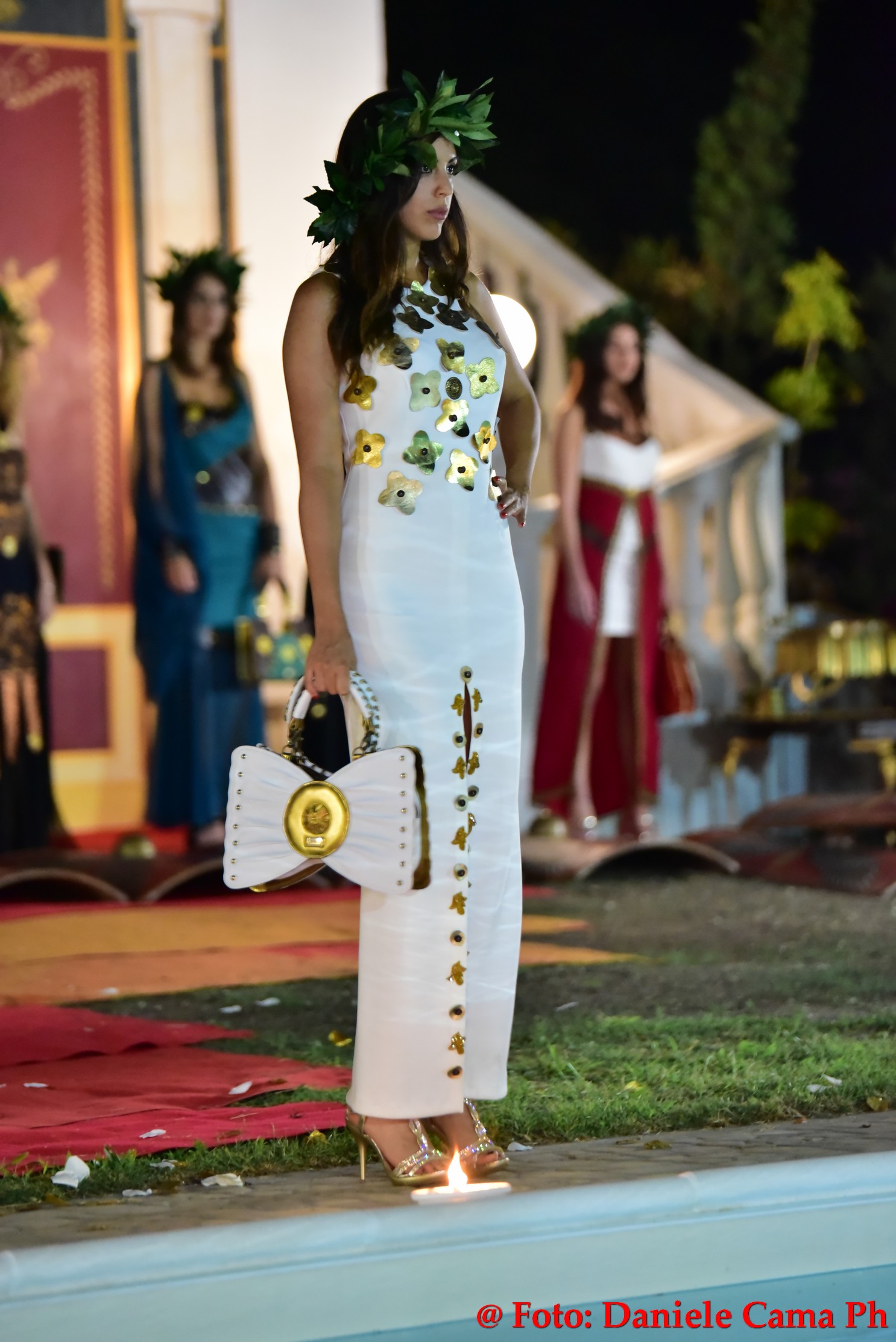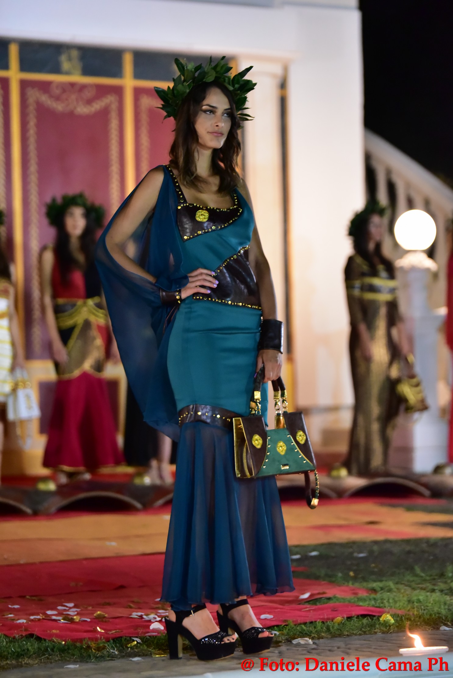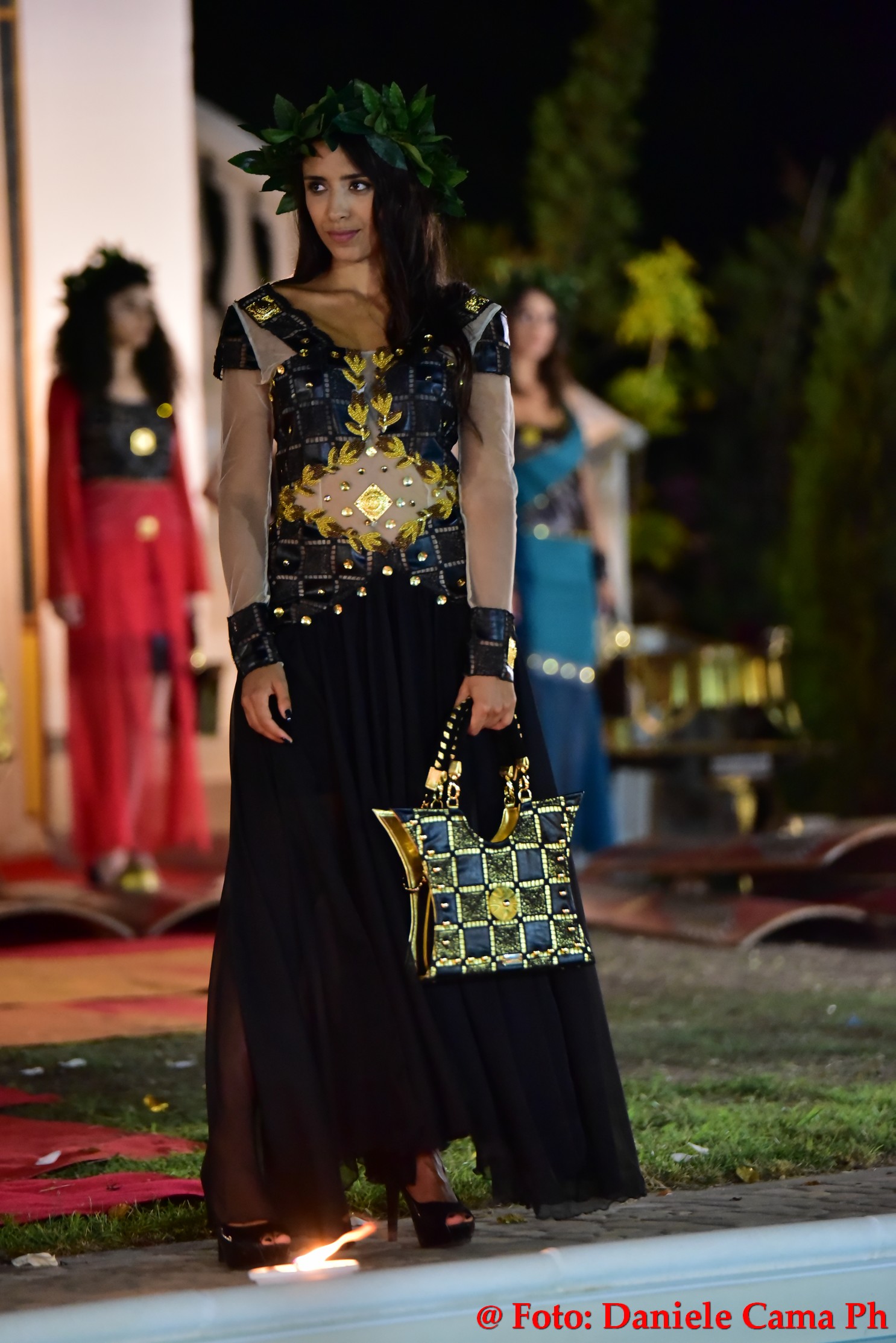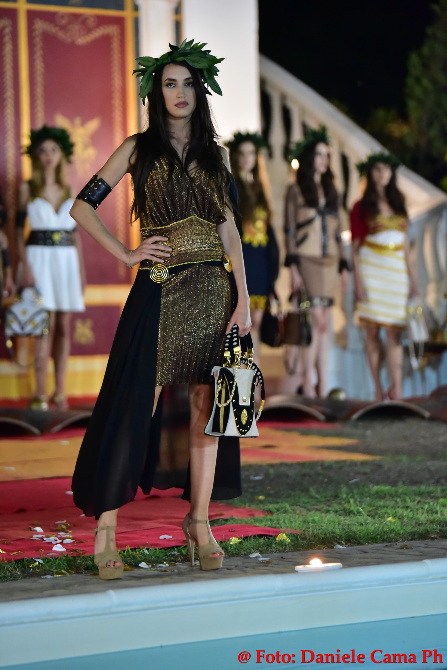 Dopodiché via alla sfilata di Alta Moda Eleonora Altamore Fashion Luxury dal titolo ‘Le Gladiatrici’. Venti splendide modelle, schierate come gladiatrici sul campo di battaglia protette da massicci scudi, lasciano intravedere le delicate vesti. Intarsi metallici di ottone, rame, ferro, si mescolano con preziosi tessuti di cashemire, voile, mikado, taffettà, neoprene, alcantara e cuoio. Un trionfo la sposa romana con il suo rituale pre-cerimonia nell’acqua della magnifica piscina della Dimora l’Amuri è, per riemergere ed indossare l’abito velatamente fluttuante ed un prezioso flammeum.