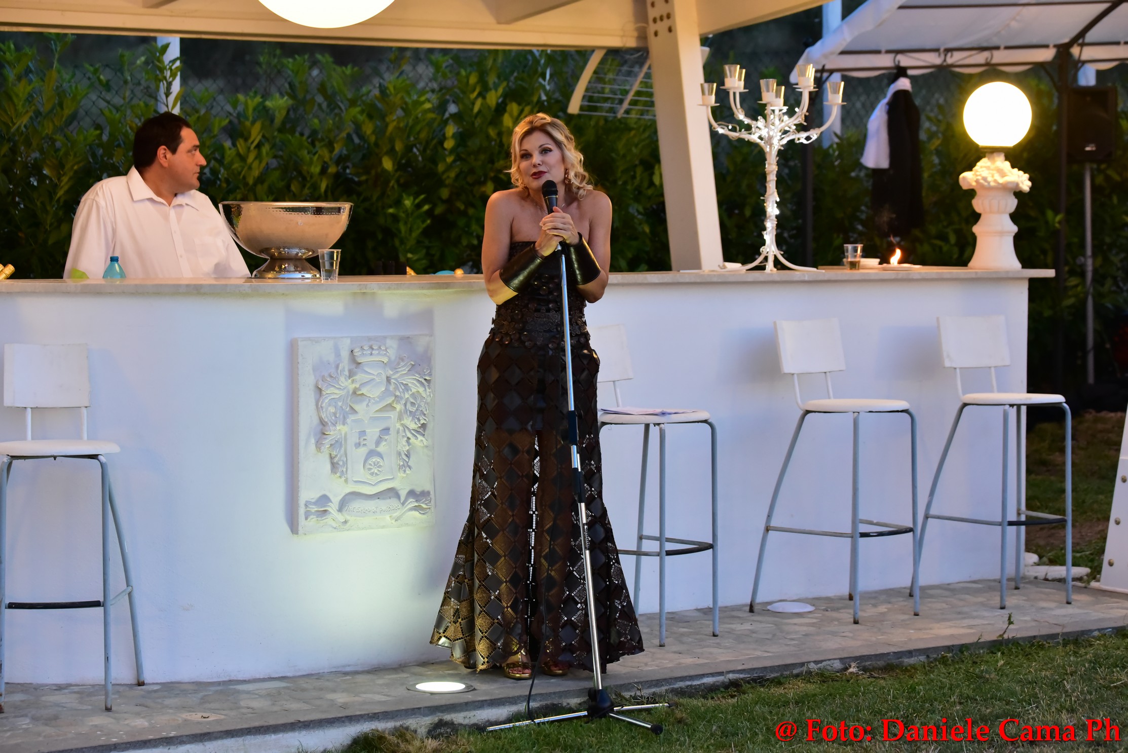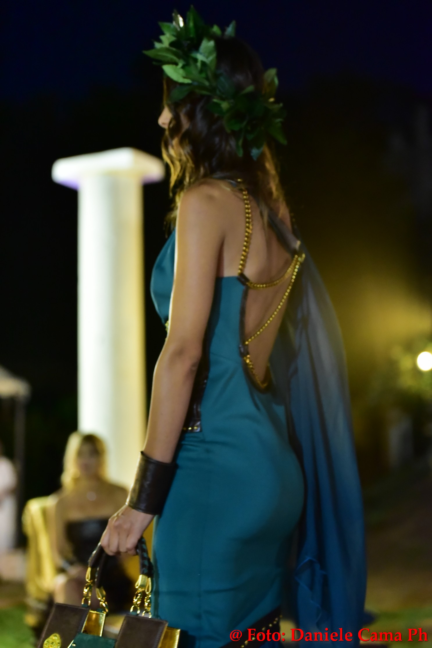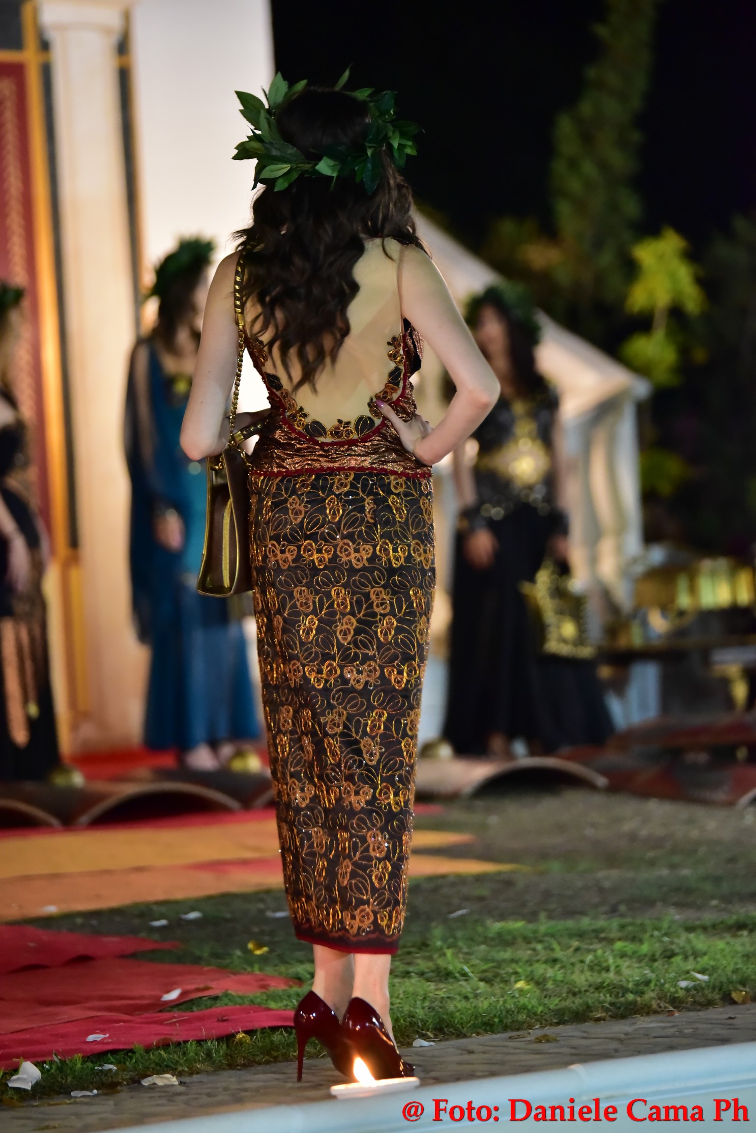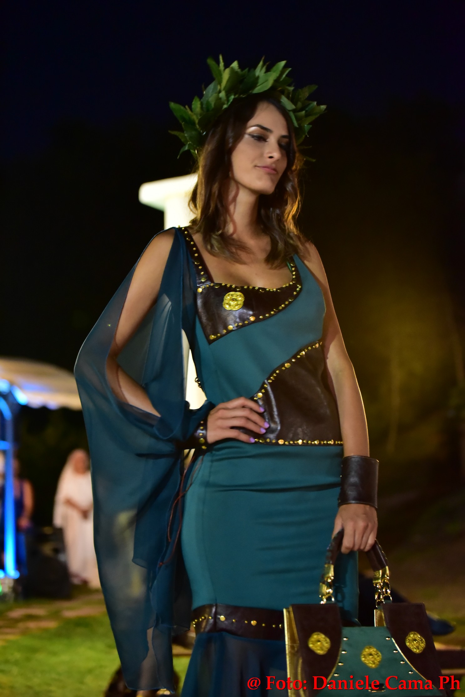 Dopodiché via alla sfilata di Alta Moda Eleonora Altamore Fashion Luxury dal titolo ‘Le Gladiatrici’. Venti splendide modelle, schierate come gladiatrici sul campo di battaglia protette da massicci scudi, lasciano intravedere le delicate vesti. Intarsi metallici di ottone, rame, ferro, si mescolano con preziosi tessuti di cashemire, voile, mikado, taffettà, neoprene, alcantara e cuoio. Un trionfo la sposa romana con il suo rituale pre-cerimonia nell’acqua della magnifica piscina della Dimora l’Amuri è, per riemergere ed indossare l’abito velatamente fluttuante ed un prezioso flammeum.