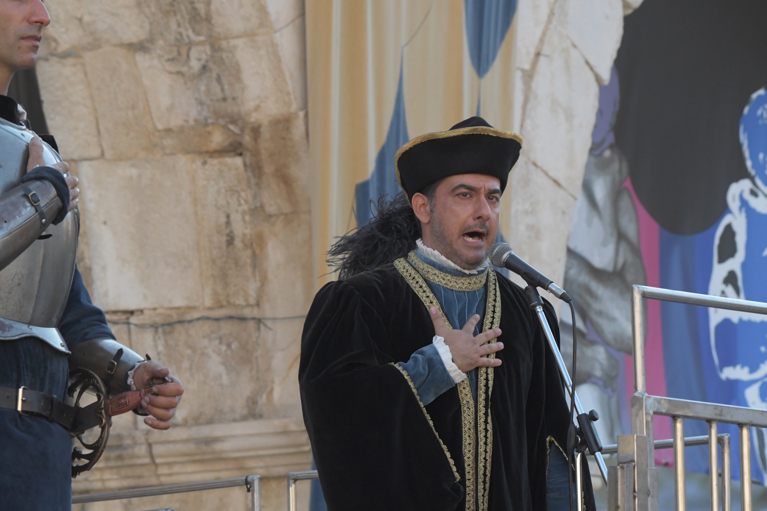 Grande emozione è stata regalata all’affollatissima platea di Piazza Maggiore anche dal cantante Piero Mazzocchetti che ha prima eseguito l'inno di Mameli, per dare il via ai combattimenti, e poi si è esibito in "Parlami d'amore Mariù", raccogliendo un lungo applauso non solo del pubblico, ma anche della Regina.