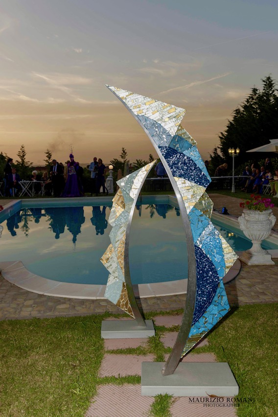 Patrizia Pellegrino ha poi intervistato l’artista Patrizia Dalla Valle, presentata dal critico d’arte Enzo Dall’Ara, purtroppo assente, ma che ha rilasciato la sua testimonianza in collegamento audio. Le meravigliose opere dell’artista sono state esposte a bordo piscina e nello show room adiacente per poterle fare ammirare a tutti i presenti. Le sue creazioni dal titolo “Ricordare il tempo” si ispirano ai diversi periodi della cultura occidentale, dalle fasi iniziali a quelle attuali. Tutte opere bi- e tridimensionali dedicate ai più importanti periodi storici della nostra civiltà, dalle prime testimonianze, risalenti al Paleolitico Superiore, a quelle più recenti, relative al XX secolo. Le opere, talora di considerevoli dimensioni, seguono un “filo rosso” continuo, esplicativo delle nostre radici e del loro sviluppo. Da memorie preistoriche a realtà storiche, le creazioni rammentano civiltà di sommo spessore, spaziando, in particolare, dalla Mesopotamia e dall'Egitto alla Grecia e a Roma, dal Medioevo e dal Rinascimento al Barocco e al Neoclassicismo, dal Romanticismo e dall'Impressionismo all'Art Nouveau e all'Art Déco. Si perviene, così, al Novecento e alle soglie del Terzo Millennio con opere di assoluta attualità lessicale, consonante con astrazione e figurazione. Patrizia Dalla Valle è mosaicista e scultrice, da sempre affascinata dall’arte bizantina e ravennate, la sua creatività la induce ad un linguaggio prevalentemente astratto, evocante dimensioni metafisiche, che le permette di colloquiare di passato e presente in proiezione futura. Ne emerge la modernità di un linguaggio che, per le sue affermate valenze storiche e per le sue intrinseche capacità operative, risulta consono con le esigenze artistiche della nostra contemporaneità.