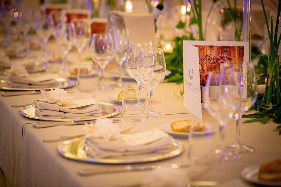 Una scenografica decorazione longitudinale dove, su una base di muschio illuminata da mille candele, spiccava il bianco candido degli agapanthus, elegantemente raccolti in vasi di cristallo dai vari volumi e dalle diverse altezze, decorando gli spazi senza eccessi, con il gusto e la sobrietà di una grande wedding designer.