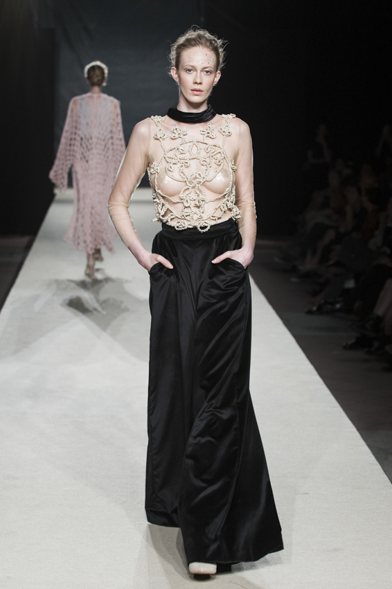 Dopo un veloce cocktail gli ospiti hanno preso posto accanto alla passerella e l’acquedotto si è animato di luci e colori, preludio all’uscita degli outfit, che si sono susseguiti in un tutt’uno fluido e coerente, che rappresenta le contaminazioni che solo una città come Roma può stimolare. Ed è così che il giovane russo vede nascere la sua ispirazione dai temi del carnevale sardo, o il giovane coreano creatore di accessori reinterpreta le lavorazioni tradizionali italiane declinandole in una sinfonia di bianco e nero, che nella sua cultura rappresenta l’universo. E ancora il nomade urbano, il cui abbigliamento versatile e tecnico scopre nuove funzioni, diventando ora tenda ora sacco a pelo.