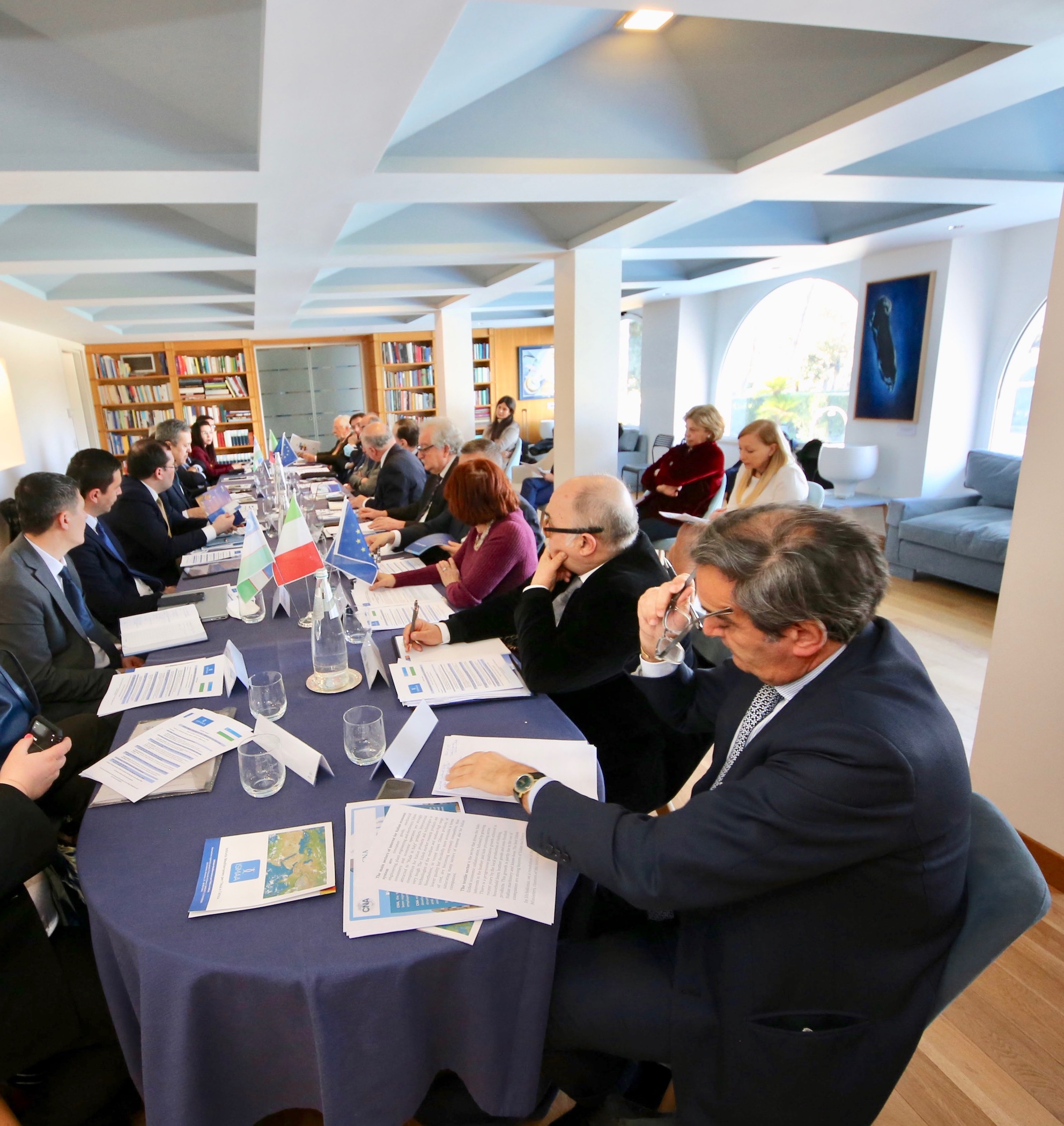 Moderatore del meeting è stato Riccardo Manara, ex ambasciatore italiano in Uzbekistan e membro dell’ISMAA. Hanno partecipato: l’Ambasciatore dell’Uzbekistan in Italia Otabek Akbarov; Maurizio Barnaba, Presidente dell’ISMAA; Vincenzo Valenti, Segretario Generale dell’ISMAA; Il Sen. Eldor Tulyakov, Direttore Esecutivo del Centro per la Strategia di Sviluppo dell'Uzbekistan; l’ex Ambasciatore in Iraq Marco Carnelos, membro del Board ISMAA e Presidente di MC Geopolicy; Umid Abidhadjaev, Direttore dell'Istituto per la previsione e la ricerca macroeconomica del Ministero dello Sviluppo Economico e della riduzione della povertà dell'Uzbekistan; Carlo De Simone, esperto Senior Relazioni Esterne SIMEST S.p.a.; Antonio Franceschini, Responsabile Ufficio Promozione e Mercato Internazionale CNA, Confederazione Nazionale Artigianato; Nilufar Nodirkhonova, Capo Dipartimento Development Strategy Center of Uzbekistan; Magda Pedace, membro del Board ISMAA e Vice Presidente Italy-Uzbekistan Friendship Association; Jamshid Sharipov, Capo Dipartimento Development Strategy Center of Uzbekistan; Prof.Luigi Mansi del CIRPS, Centro Interuniversitario Ricerca per lo Sviluppo Sostenibile. Ha concluso l'On. Ugo Intini, membro del Consiglio ISMAA ed ex Vice Ministro degli Affari Esteri. Alla tavola rotonda ha preso parte anche l’On. Vincenzo Scotti, ex Presidente e fondatore della Link Campus University.