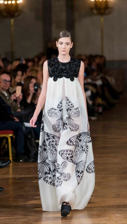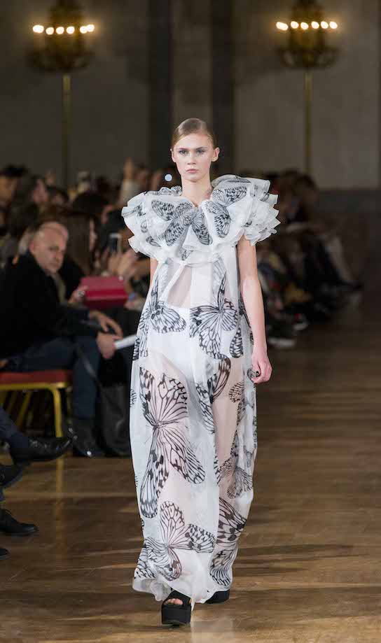 Tessuti stampati, su chiffon, organza e satin, broccati realizzati da antichi telai del 1700 della storica azienda Gustavo De Negri, raffigurano voli di piccole e grandi farfalle, in una sensuale e poetica rappresentazione orientale. I soprabiti con ricami di farfalle di paillettes e cristalli neri su tessuti come broccati, la tripla organza, satin e taffetas; abiti lunghi, kimoni ampi dalle linee essenziali realizzati in broccato di seta lurex con pantaloni lunghi a palazzo.