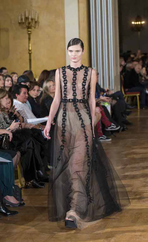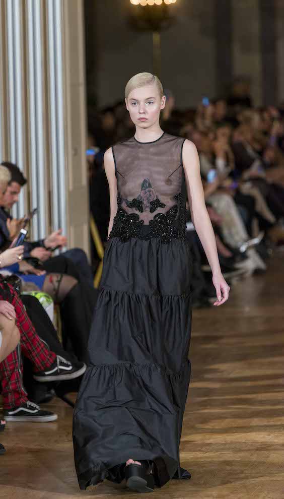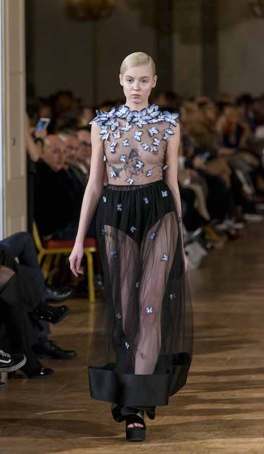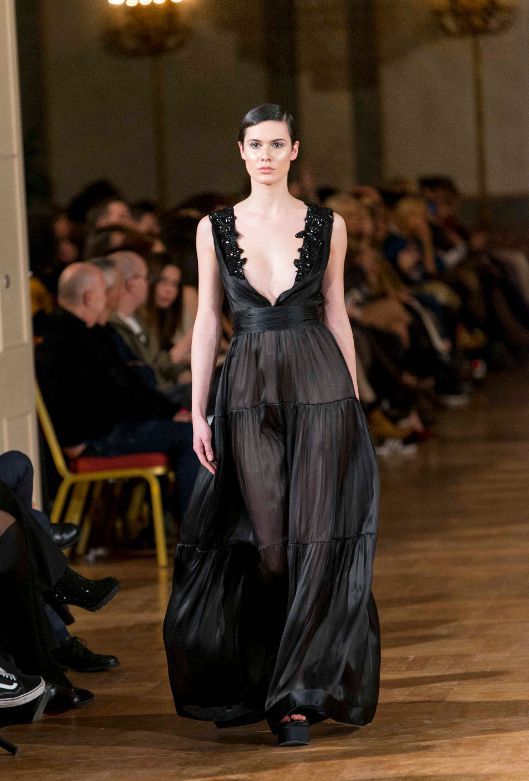 Per la sera Nino Lettieri ha proposto abiti total black impreziositi da farfalle ricamate con paillettes e jais neri su tessuti come l’organza, lo chiffon e la taffettà, mescolando linee essenziali, pieghe e trasparenze impalpabili.