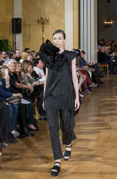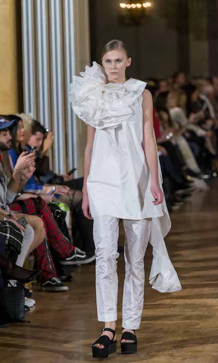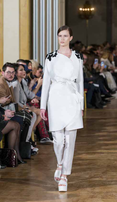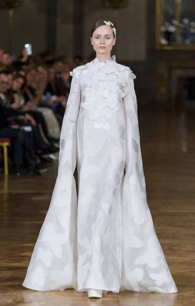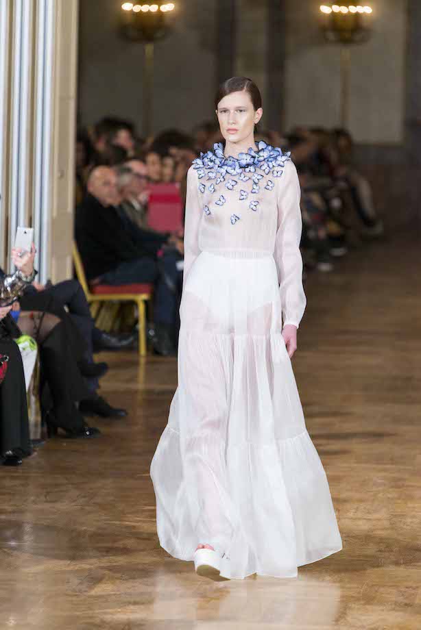In passerella 40 outfit dai colori che si alternano dal bianco candido al nero assoluto, l’opulenza dell’oro, fino ad arrivare all'azzurro cielo. Giochi di pieghe, rouches e volant la fanno da padrone.
