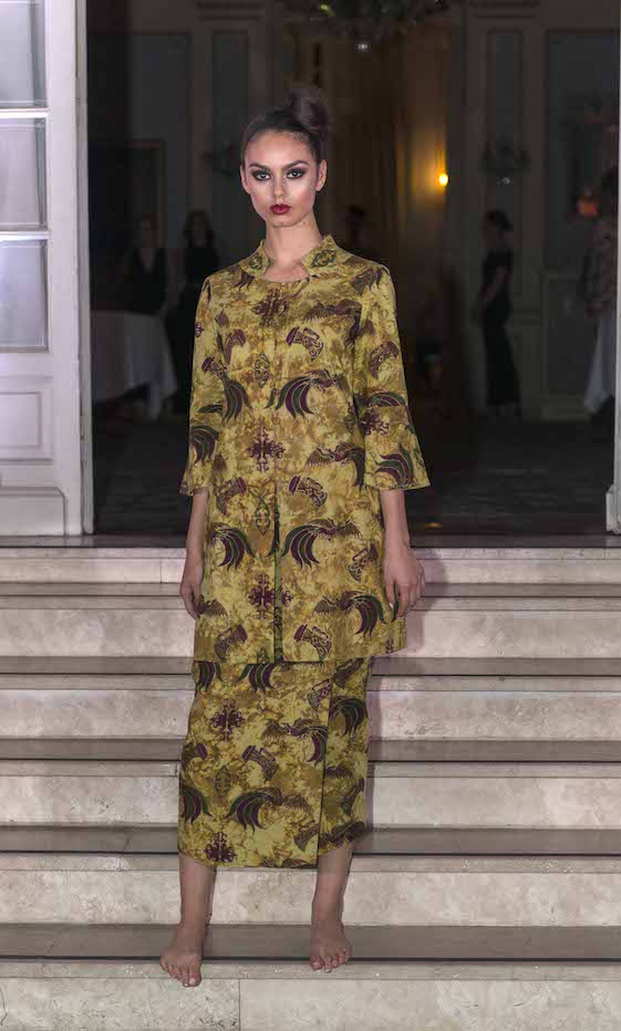 Costruita accuratamente a mano dagli stessi studenti, supportati dal corpo docente, la collezione ha voluto omaggiare il ritmo delle sfilate tradizionali, concepite seguendo lo scandire dei tre momenti principali della giornata: mattina, pomeriggio, sera, ricreando le atmosfere dell’atelier di moda di un tempo in cui le modelle sfilavano tra gli ospiti. Un tuffo nel passato dunque, in cui si sono potute ammirare le collezioni che hanno sfilato tra i saloni e il giardino dell’Ambasciata, comodamente seduti negli sfarzosi salotti d'epoca o nel giardino, deliziati dalle particolarissime pietanze tipiche indonesiane, servite con garbo e raffinatezza dai camerieri in perfetta divisa bianca. Il tutto per fare rivivere un'epoca che non c'è più, quegli anni glamour che con nostalgia rimpiangiamo.