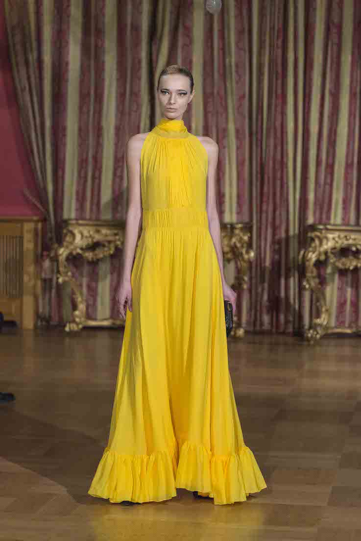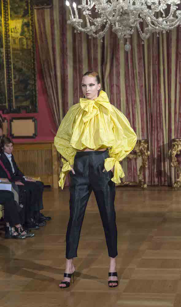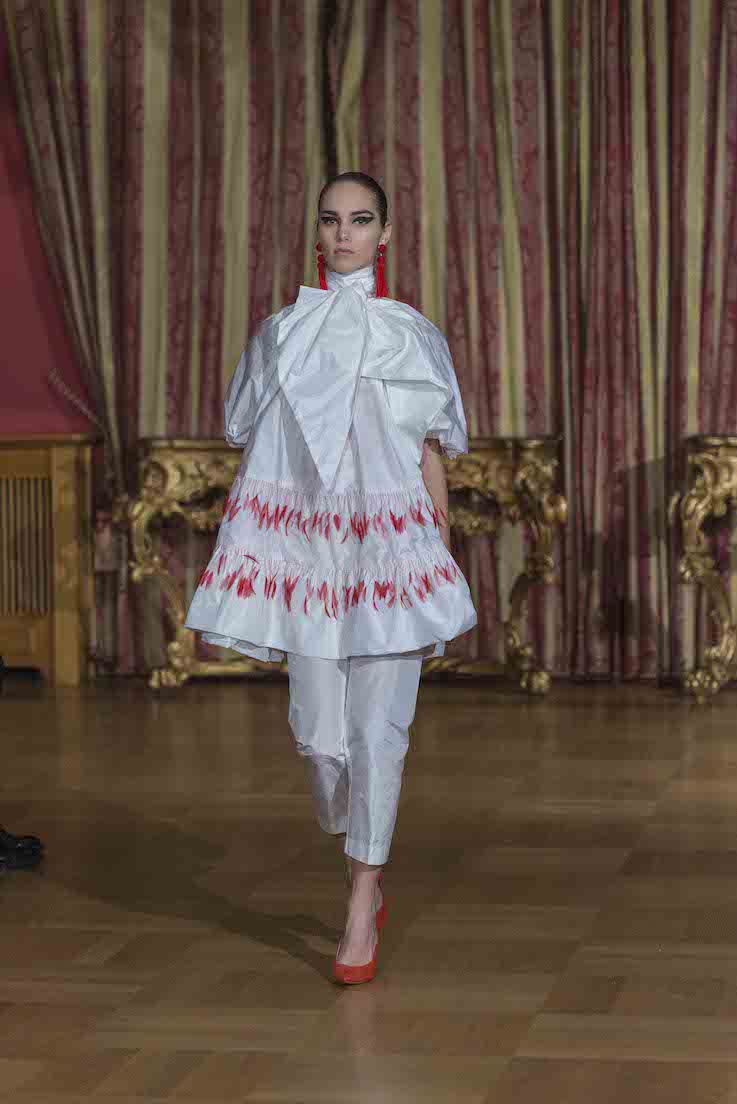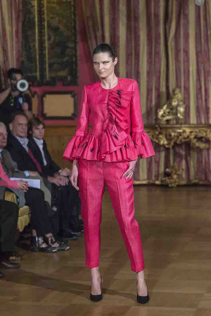 Cinquanta outfit sartoriali, dalle linee fluttuanti, sui quali protagonisti sono i “fiocchi”. Oltre al classico ed irrinunciabile black and white, molte le creazioni proposte con svariati colori dal giallo al fucsia dal verde al glicine dal blu al rosa per i tailleur, ricami unici e preziosi per gli abiti da sera.