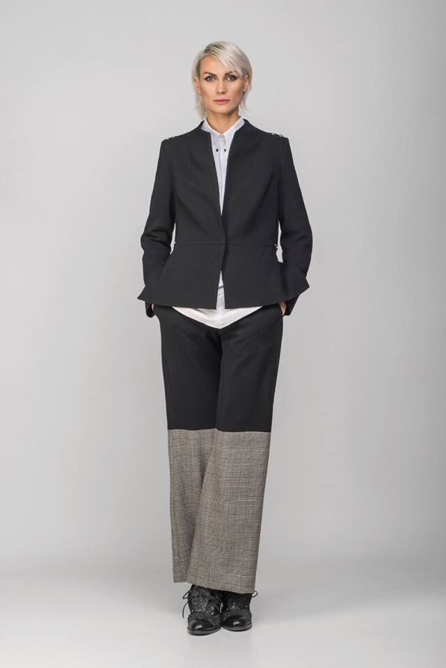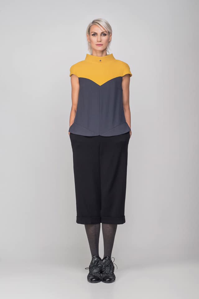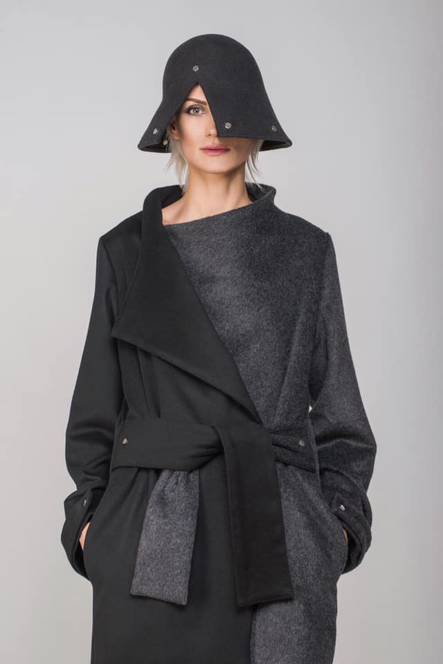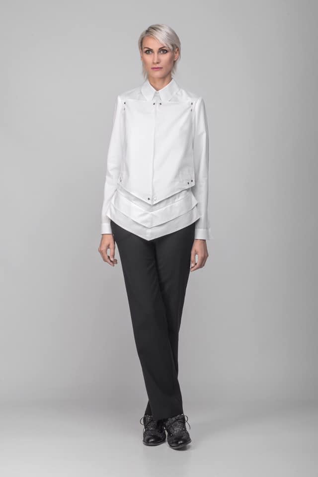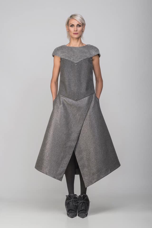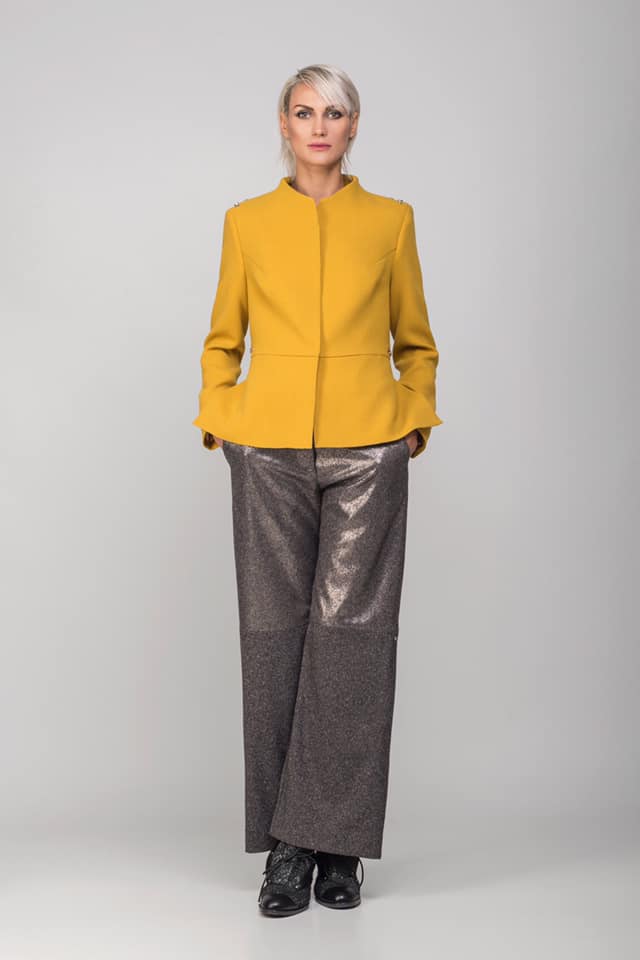 Le armature di stoffa di Vittorio Camaiani vestono una guerriera contemporanea che combatte il tempo e i ritmi vorticosi della vita moderna senza rinunciare alla femminilità ricercata della haute couture, in una palette cromatica che attraversa tutte le nuances del grigio passando per il rosso lacca e il giallo senape.